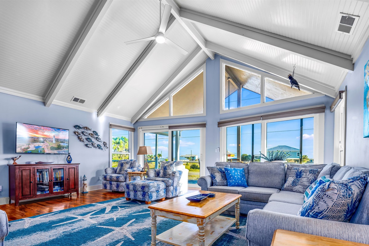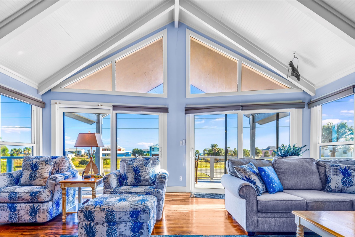 The open, spacious vaulted ceilings of the living room with wrap-around views of the Gulf are the picture-perfect setting. Large sliding doors allow you to bring the outdoors inside. Warm wood floors and an open living/dining/kitchen floor plan make this the focal point for fun with family and friends.