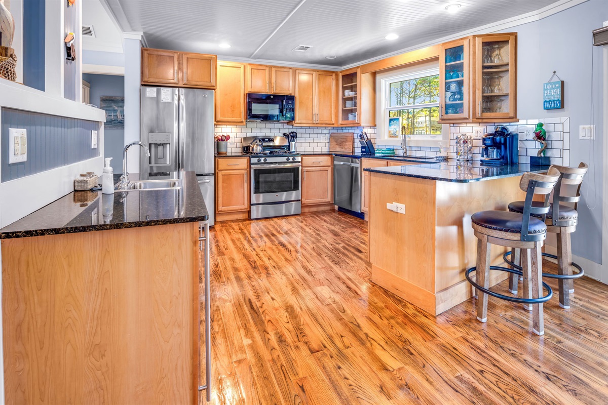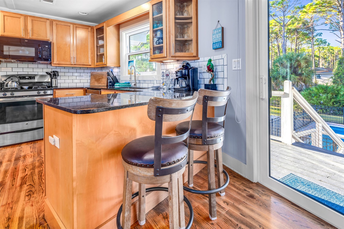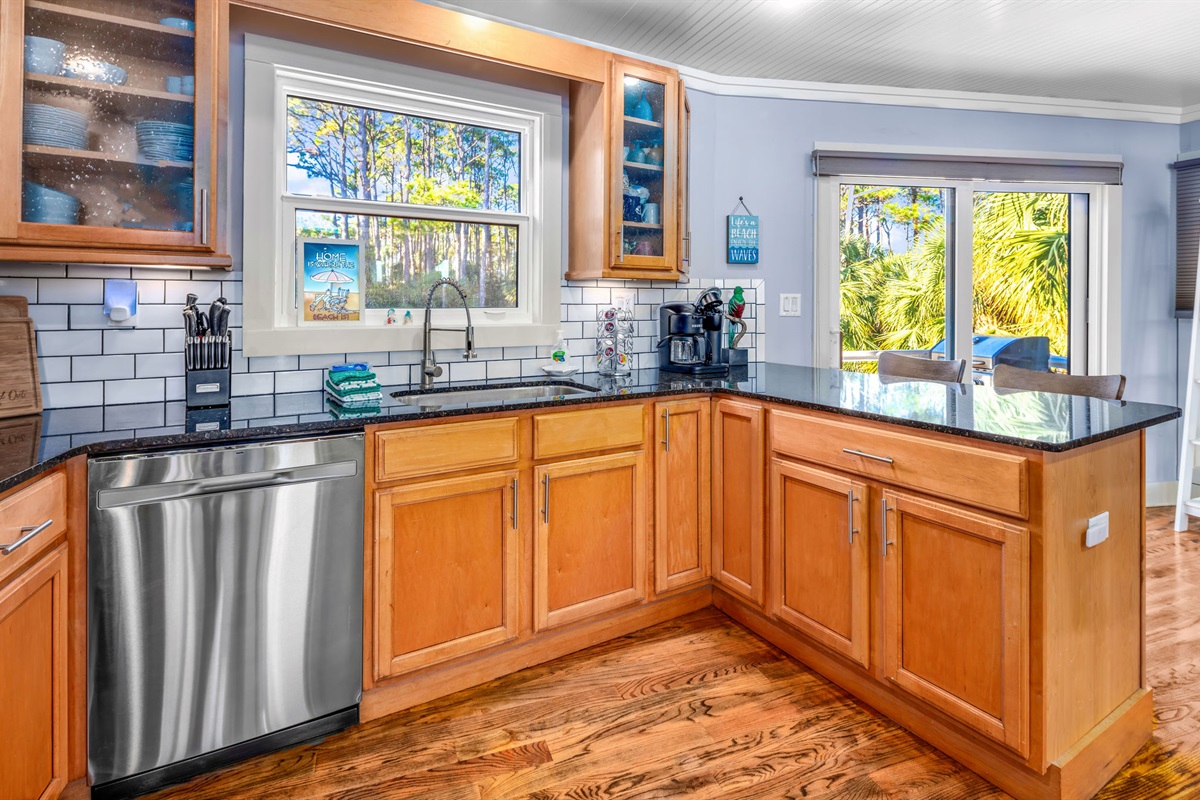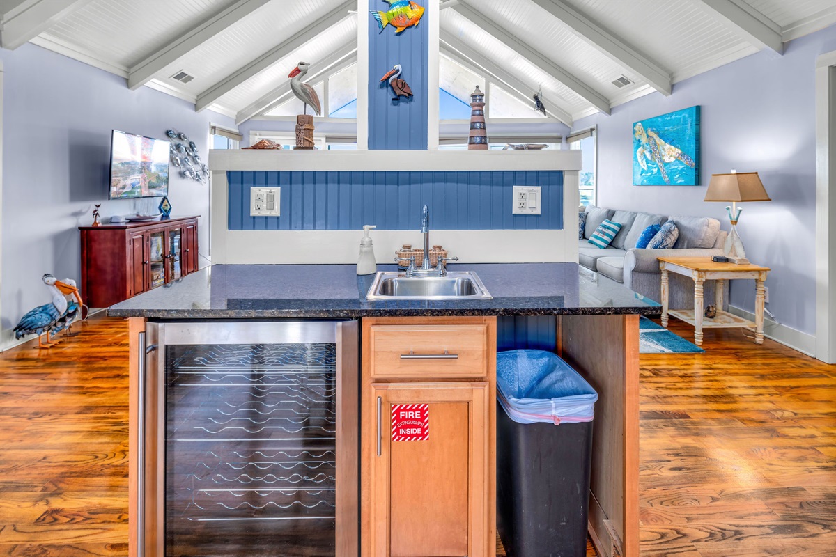 There's lots of comfortable seating at mealtimes, and the well-appointed kitchen with gas stove, granite counters, and stainless steel appliances provides all you need to prepare delicious coastal meals. A gas grill is provided just off the kitchen to dazzle everyone with your fisherman's catch! A convenient wet bar boasts a wine cooler, sink, and counter space for preparing your beverages.