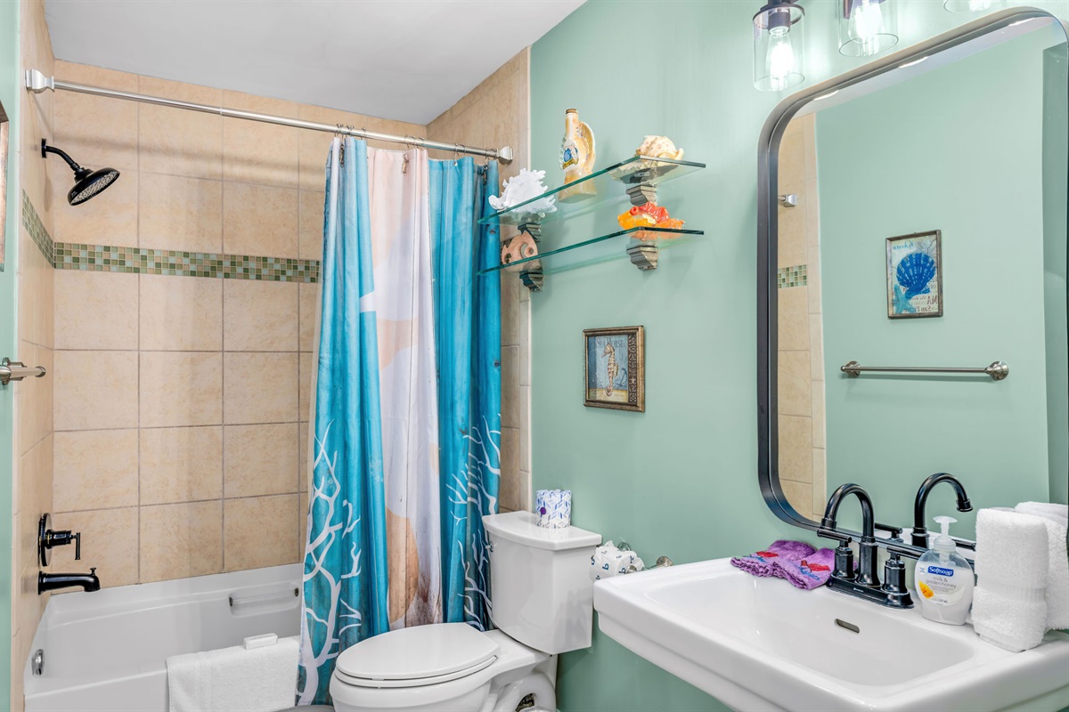Bathrooms include shower/tub combinations. Additionally, blow dryers, an iron/ironing board, and beach towels.