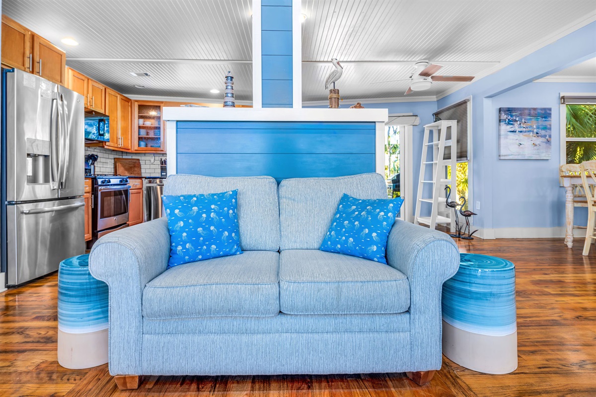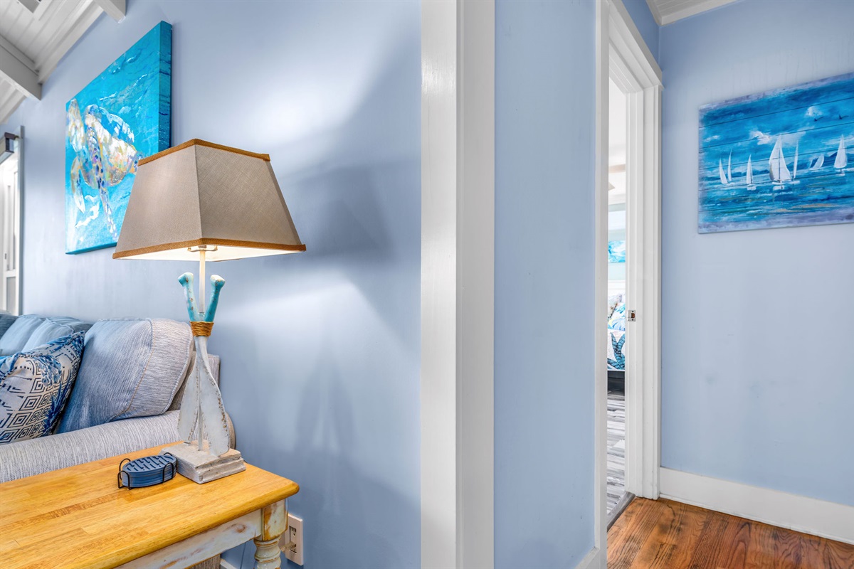 The living room offers light, coastal décor with comfy furnishings, and a large flatscreen TV.