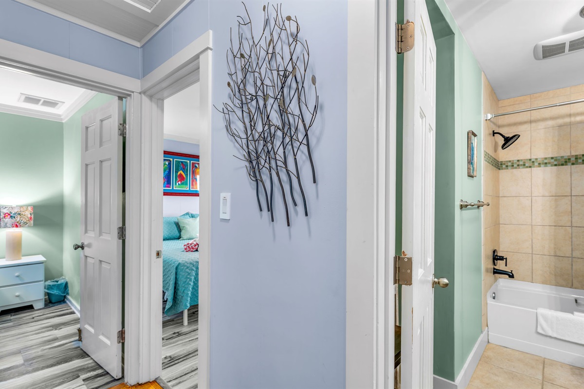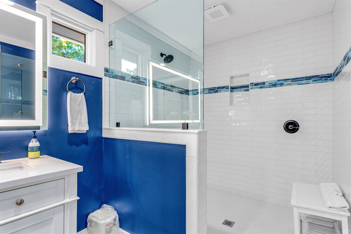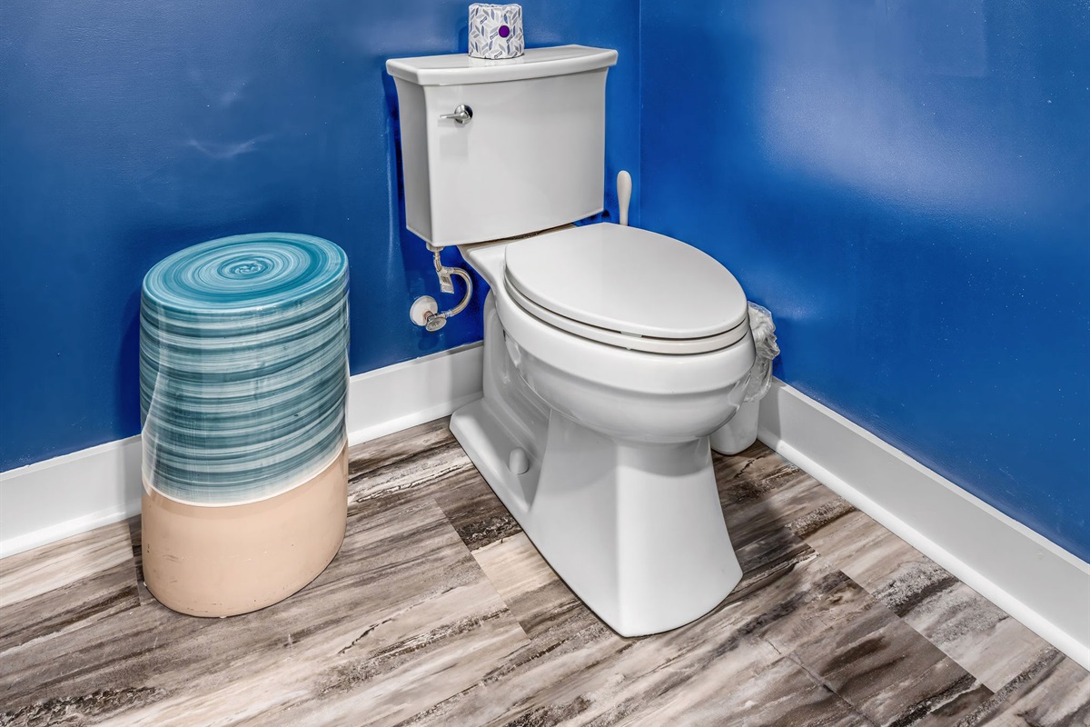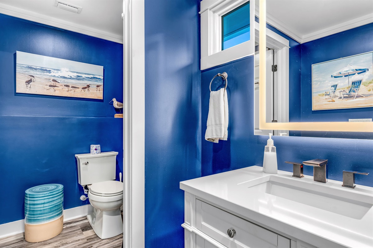 1/2 bath with storage of beach chairs, umbrella, and pool toys in the enclosed room under the house for convenience from the pool or under the house gatherings.