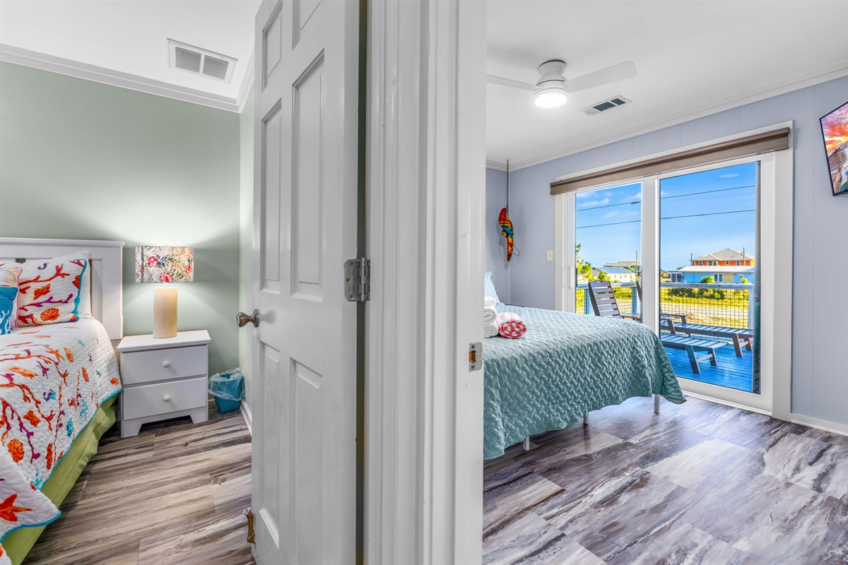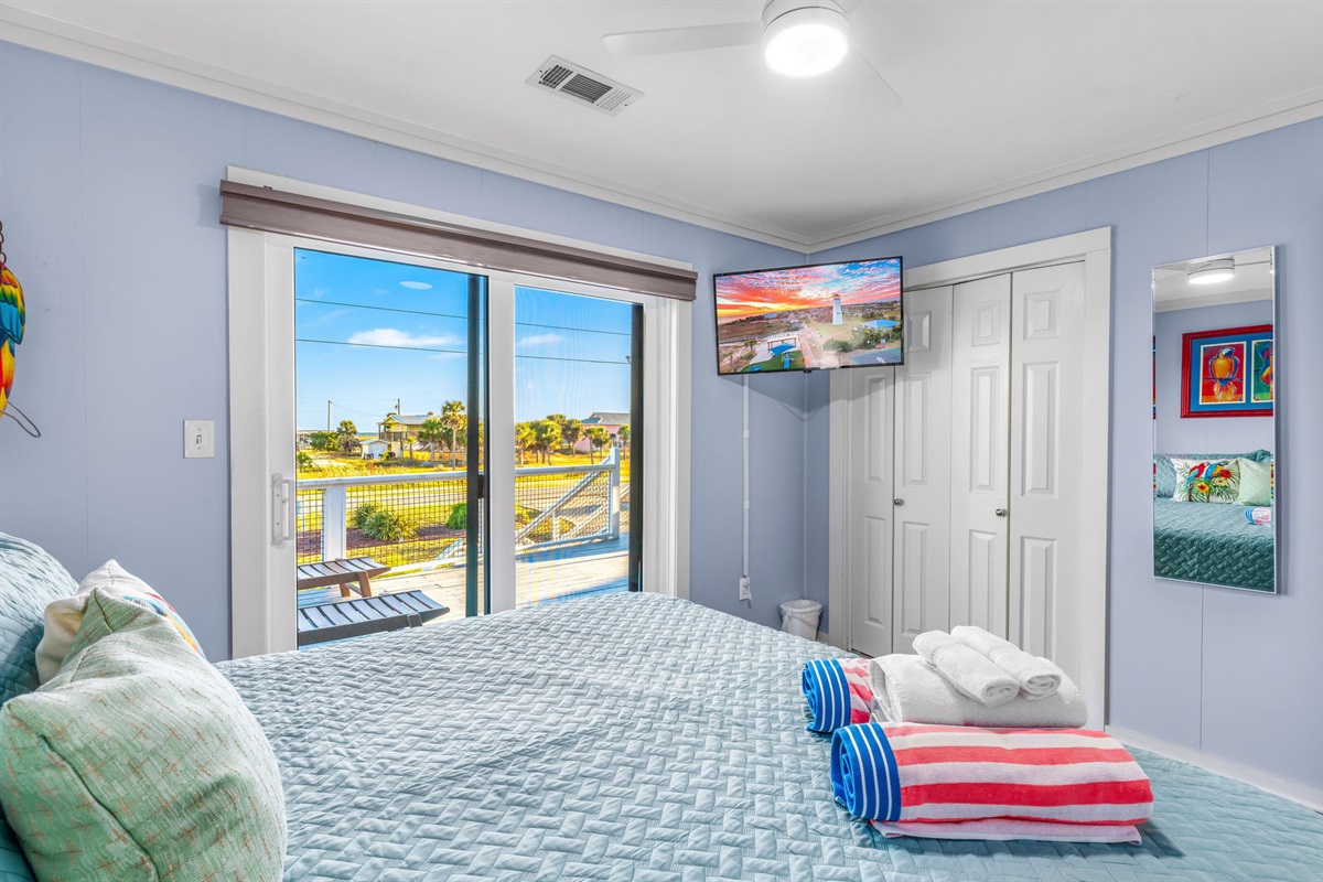 The NE king bedroom offers a flatscreen TV, direct access to the deck, and a shared full bathroom.