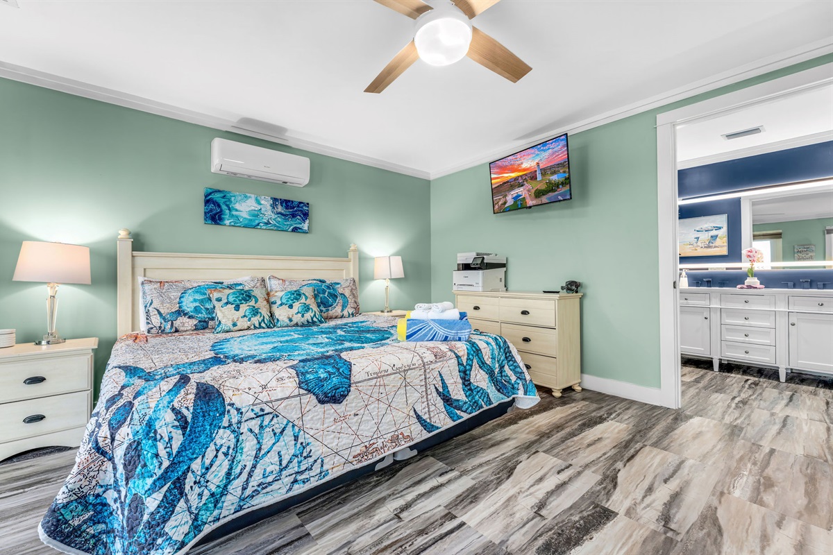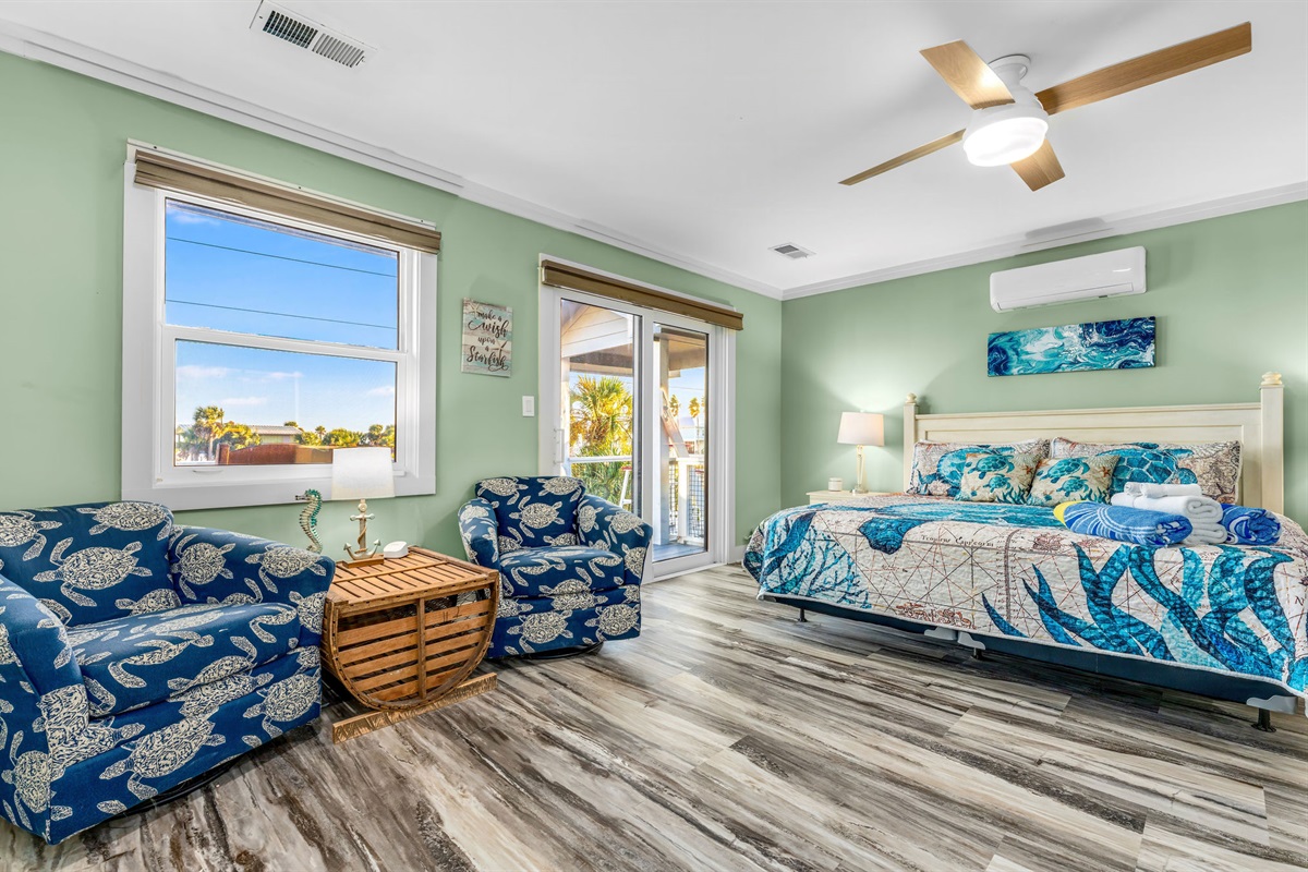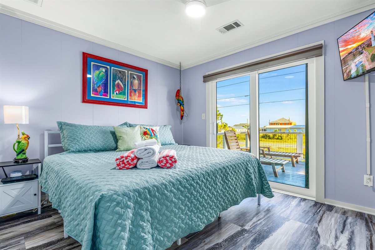The NW king master provides a full private bathroom, flat-screen TV, direct access to both front and back decks, and a private sitting area for relaxation.