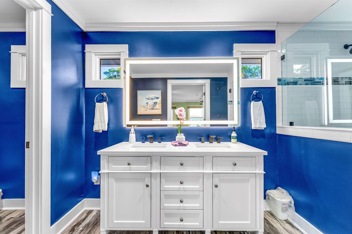 With two convenient entrances in the front and back, the living spaces are easily accessible from the pool deck and entrance. The breezy deck with covered and exposed spaces offers wonderful relaxation with chaise lounges, rocking chairs for your morning coffee, a dining table seating 6 and a bonus special lookout deck for a sunset cocktail. The private outdoor shower with hot and cold water is a must for any stay at the beach!