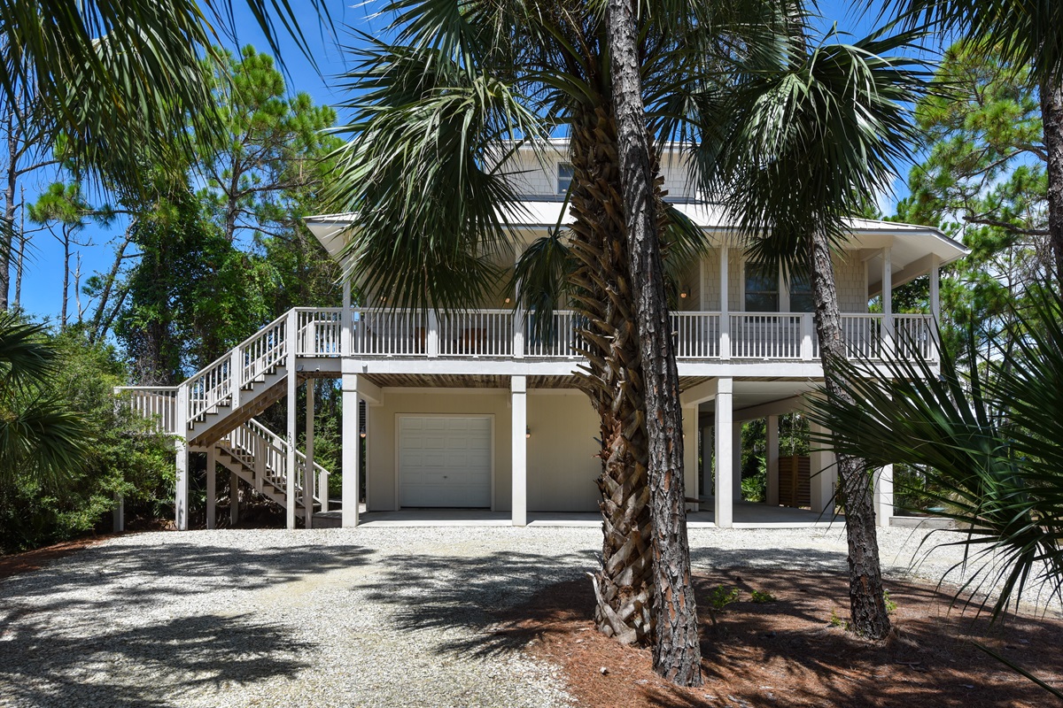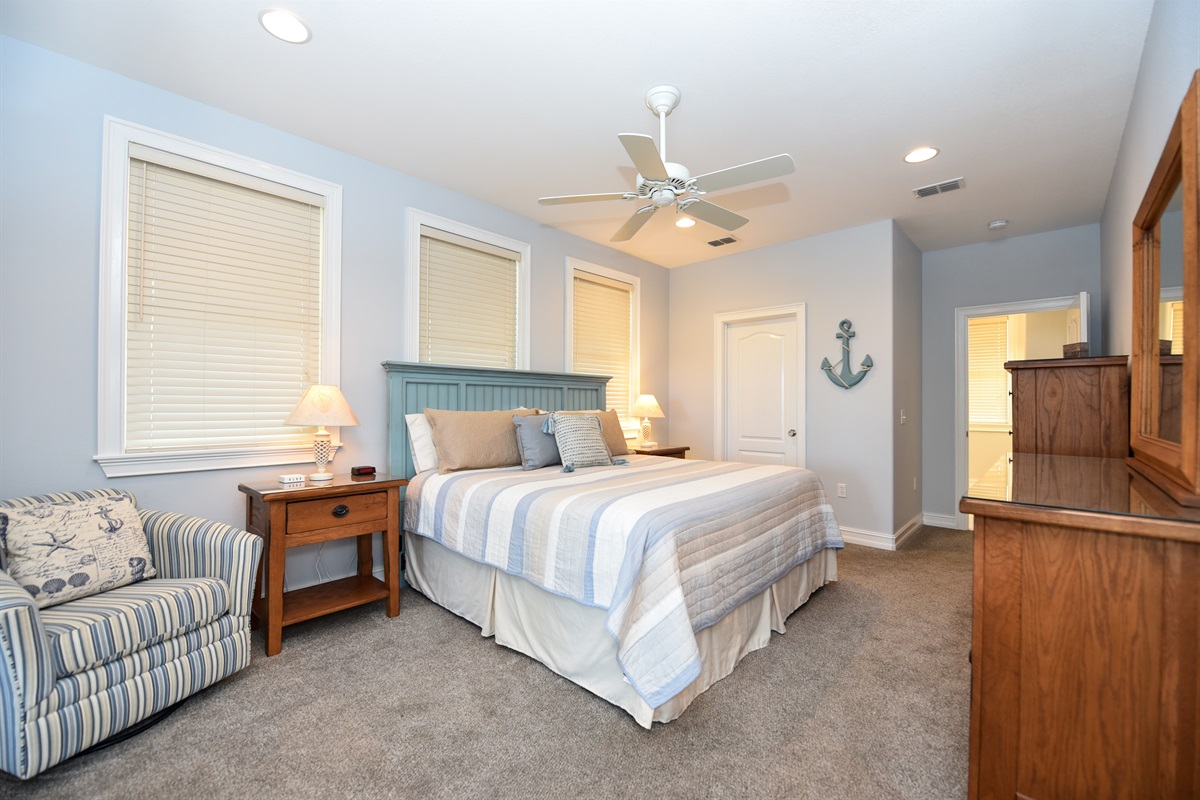 The second floor offers the NW king bedroom with a flat screen TV and direct access to the balcony through French doors. The SE bunk room sleeps 8 in 2 queen/queen bunk beds and offers a flat screen TV and direct access to the balcony to witness those famous sunsets. A shared bathroom with 2 sinks and separate water closet are provided on this floor.