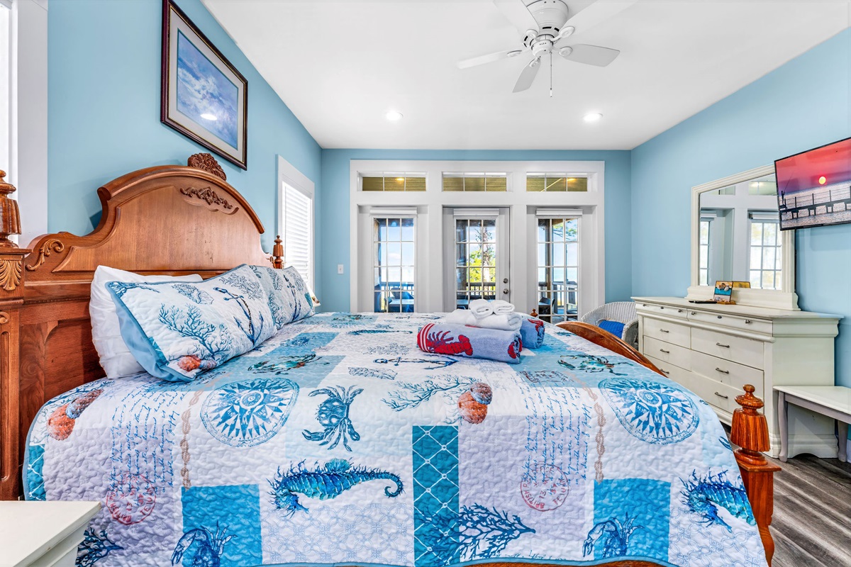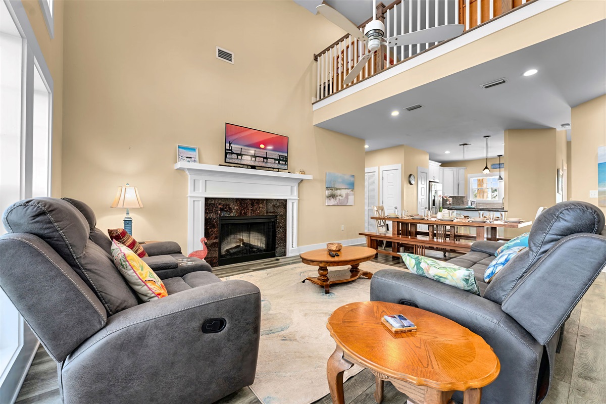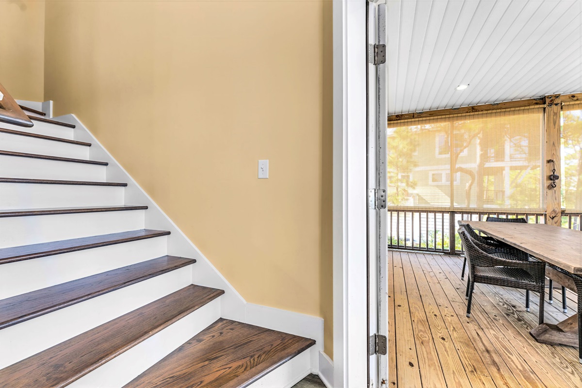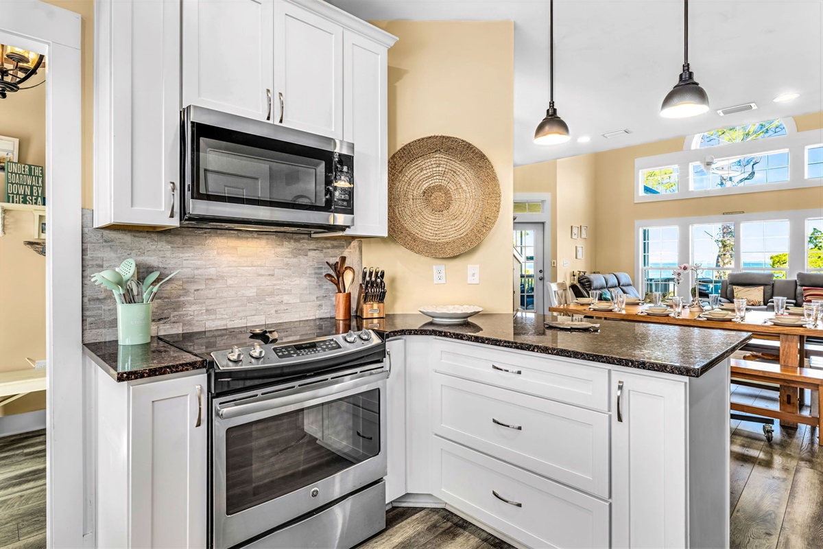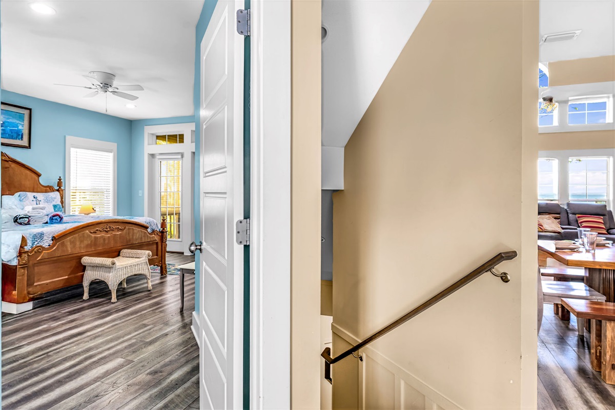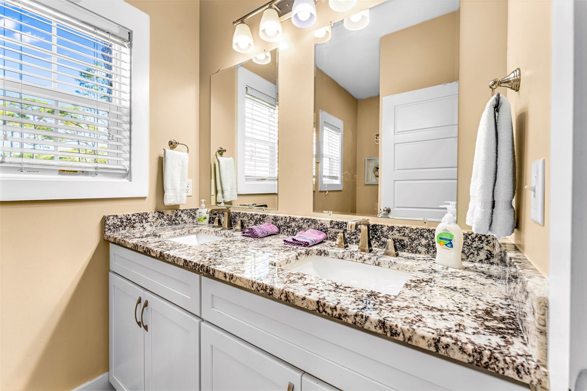 The main level of Dock Holiday offers an open floor plan with a modern, well-appointed kitchen with stainless appliances and granite counter tops. The kitchen is open to the dining and living areas to enjoy family and friends while preparing the day’s catch. A wall of windows in the living area offers stunning bay views from the living, dining and kitchen areas. A large flat screen TV is in the living area for family movie night. Also on the main level is the large master suite with king size bed, views of the bay, a flat screen TV, as well as an electric fireplace for those chilly winter evenings, and access to the screened porch. A convenient half bath is located off the foyer. The master bedroom bath has a double vanity and walk-in shower. Also on the main level are a bedroom with a queen size bed, flat screen TV and views of the bay, as well as a 3rd bedroom with 2 full size beds and a flat screen TV. A convenient common full bath with double vanity sits between these two bedrooms. The laundry closet with full size washer and dryer is on this level.