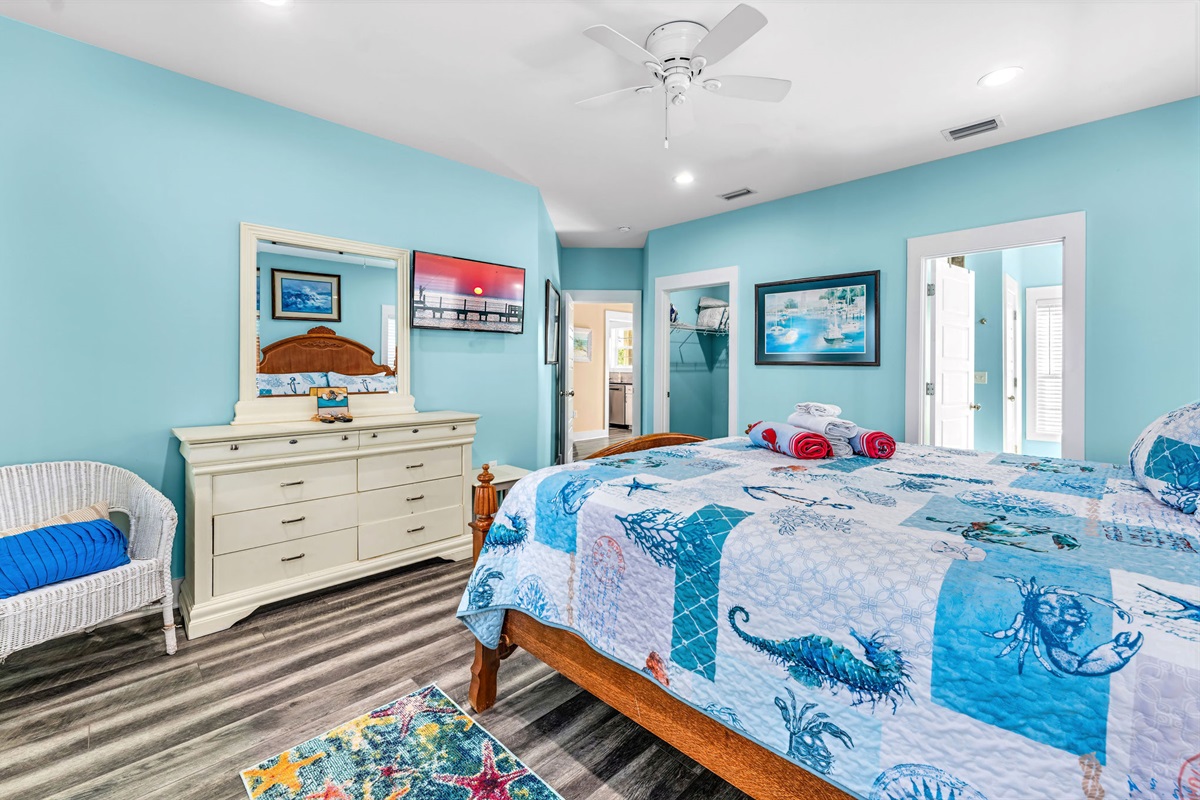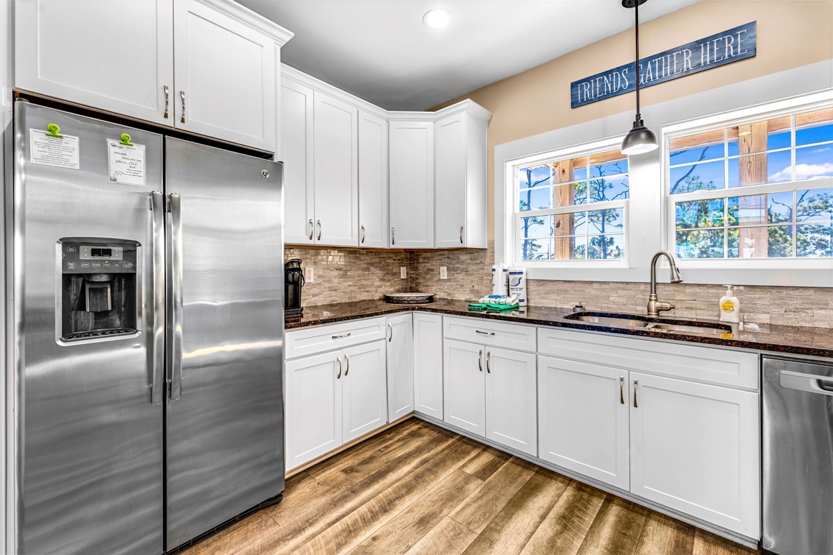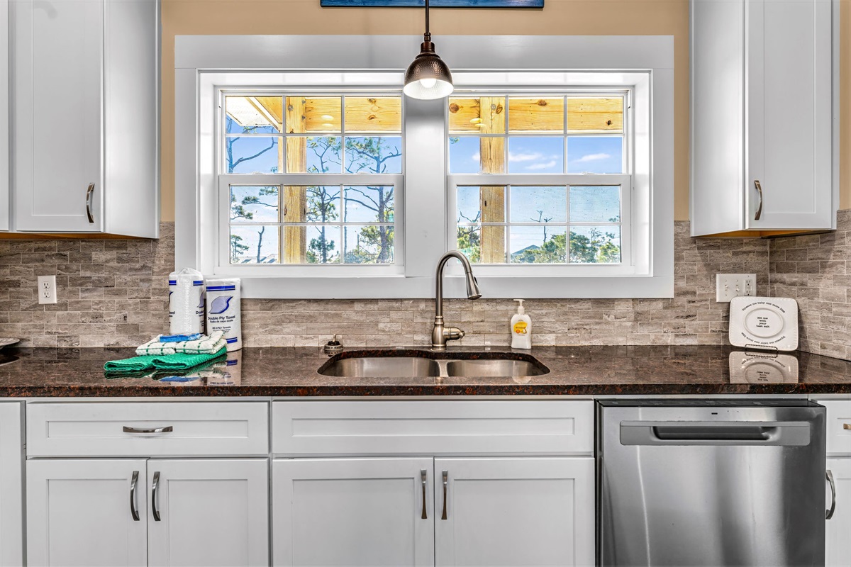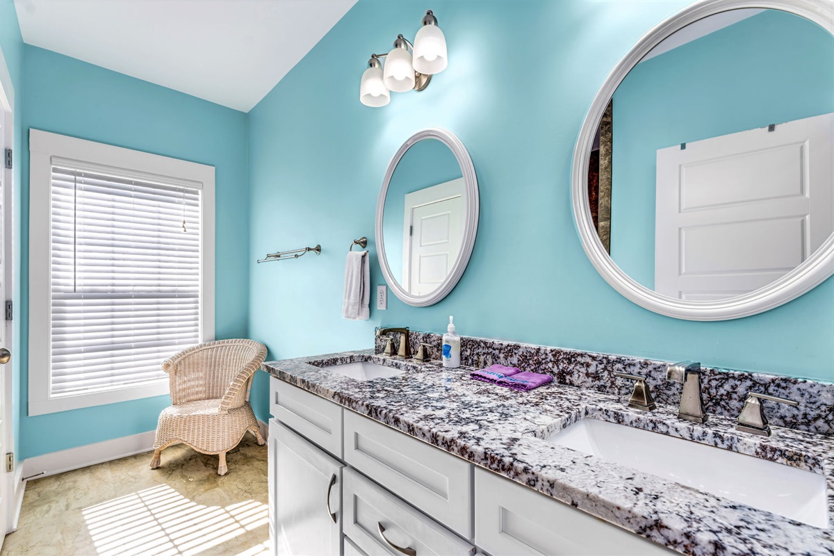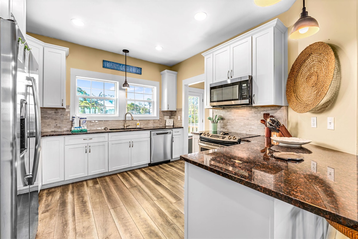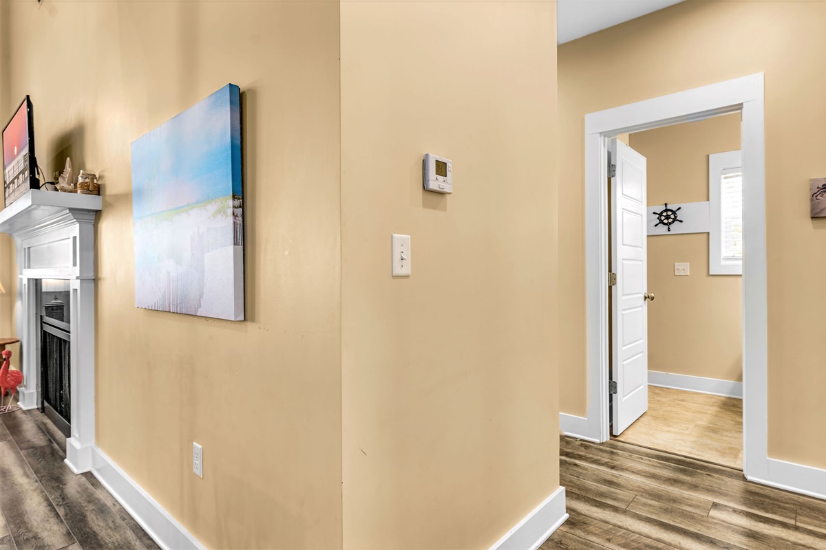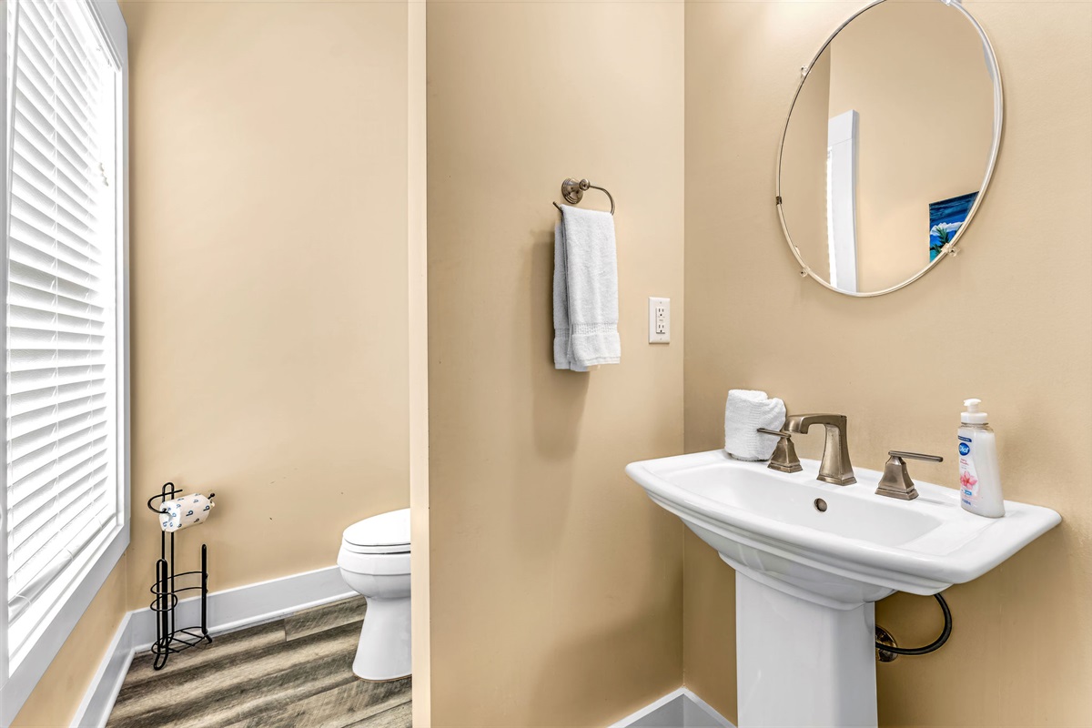 The main level of Dock Holiday offers an open floor plan with a modern, well-appointed kitchen with stainless appliances and granite counter tops. The kitchen is open to the dining and living areas to enjoy family and friends while preparing the day’s catch. A wall of windows in the living area offers stunning bay views from the living, dining and kitchen areas. A large flat screen TV is in the living area for family movie night. Also on the main level is the large master suite with king size bed, views of the bay, a flat screen TV, as well as an electric fireplace for those chilly winter evenings, and access to the screened porch. A convenient half bath is located off the foyer. The master bedroom bath has a double vanity and walk-in shower. Also on the main level are a bedroom with a queen size bed, flat screen TV and views of the bay, as well as a 3rd bedroom with 2 full size beds and a flat screen TV. A convenient common full bath with double vanity sits between these two bedrooms. The laundry closet with full size washer and dryer is on this level.