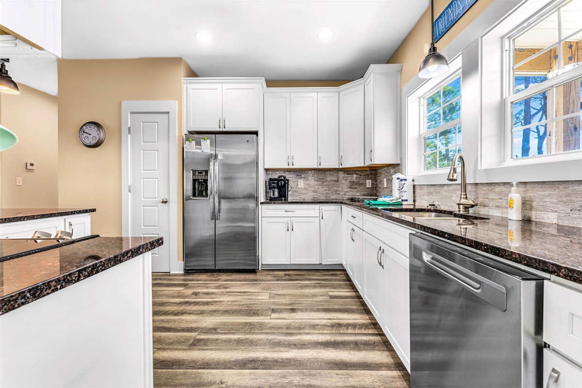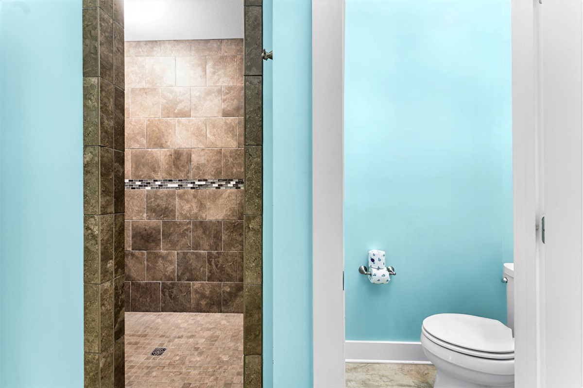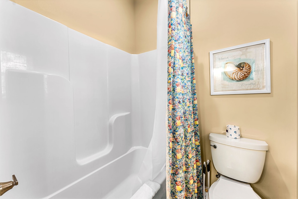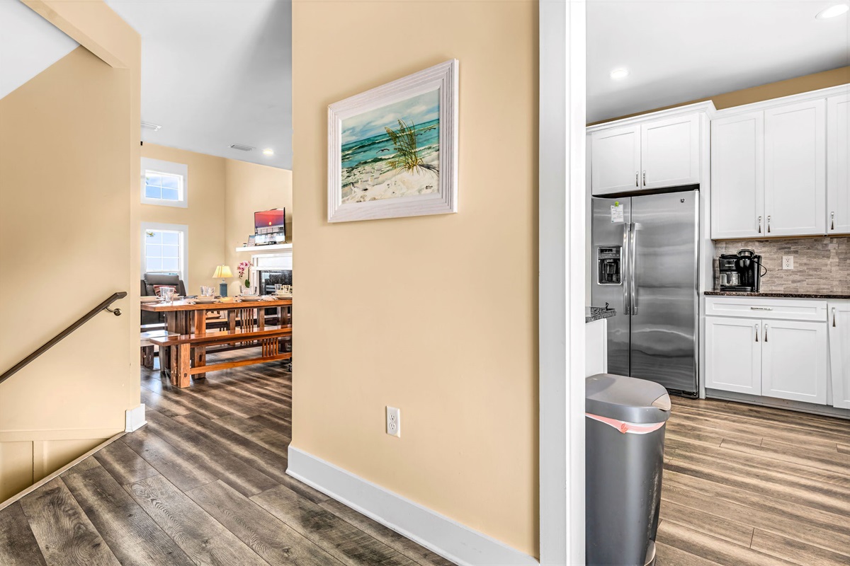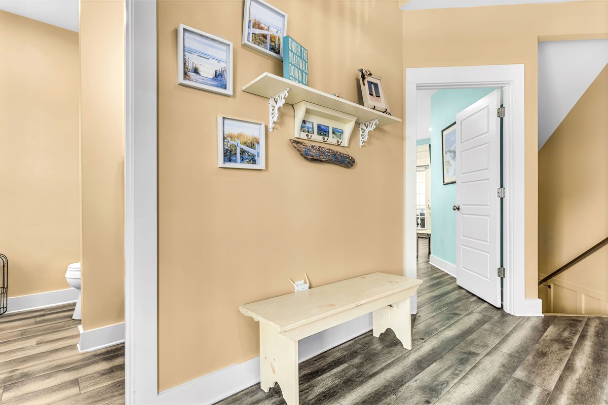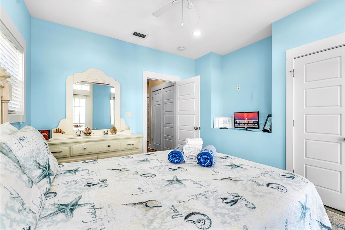 The main level of Dock Holiday offers an open floor plan with a modern, well-appointed kitchen with stainless appliances and granite counter tops. The kitchen is open to the dining and living areas to enjoy family and friends while preparing the day’s catch. A wall of windows in the living area offers stunning bay views from the living, dining and kitchen areas. A large flat screen TV is in the living area for family movie night. Also on the main level is the large master suite with king size bed, views of the bay, a flat screen TV, as well as an electric fireplace for those chilly winter evenings, and access to the screened porch. A convenient half bath is located off the foyer. The master bedroom bath has a double vanity and walk-in shower. Also on the main level are a bedroom with a queen size bed, flat screen TV and views of the bay, as well as a 3rd bedroom with 2 full size beds and a flat screen TV. A convenient common full bath with double vanity sits between these two bedrooms. The laundry closet with full size washer and dryer is on this level.