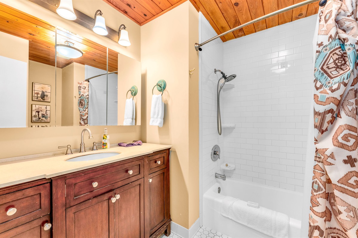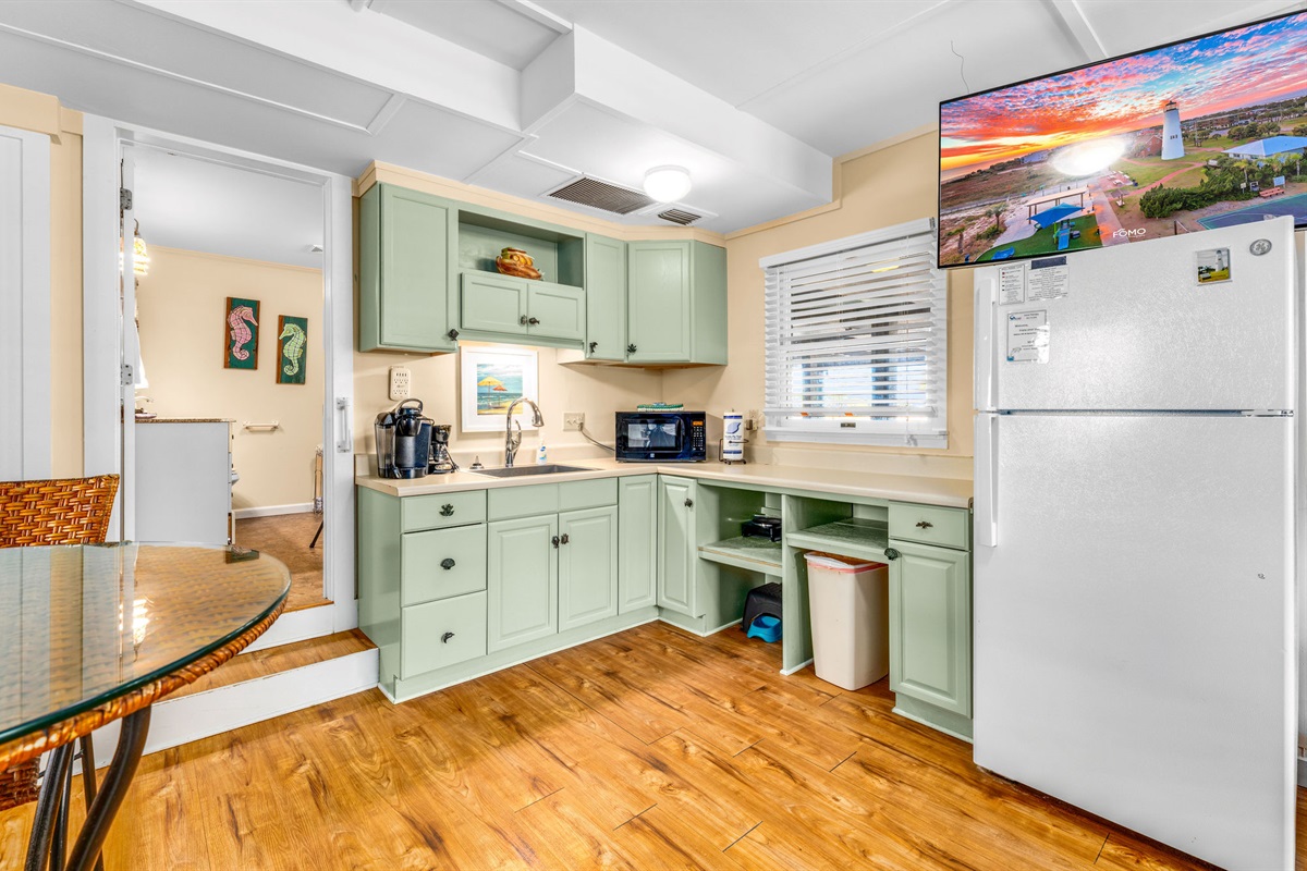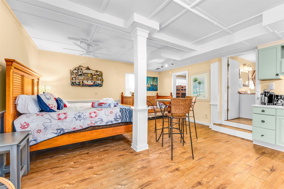The ground level provides a family suite, with its own access and is not connected to the upstairs accommodations. The suite sleeps up to 8 with a bunk room of 4, a large open room with a king bed and a daybed with trundle, large tv, bathroom, washer and dryer, kitchenette with full size refrigerator, microwave, toaster oven and coffee maker.