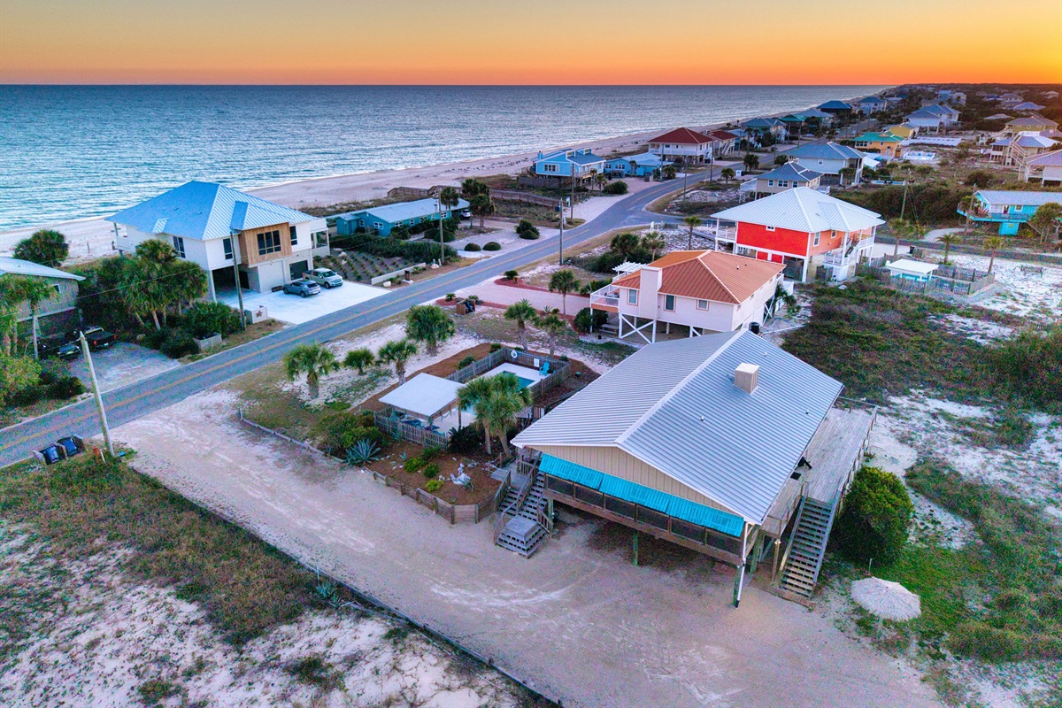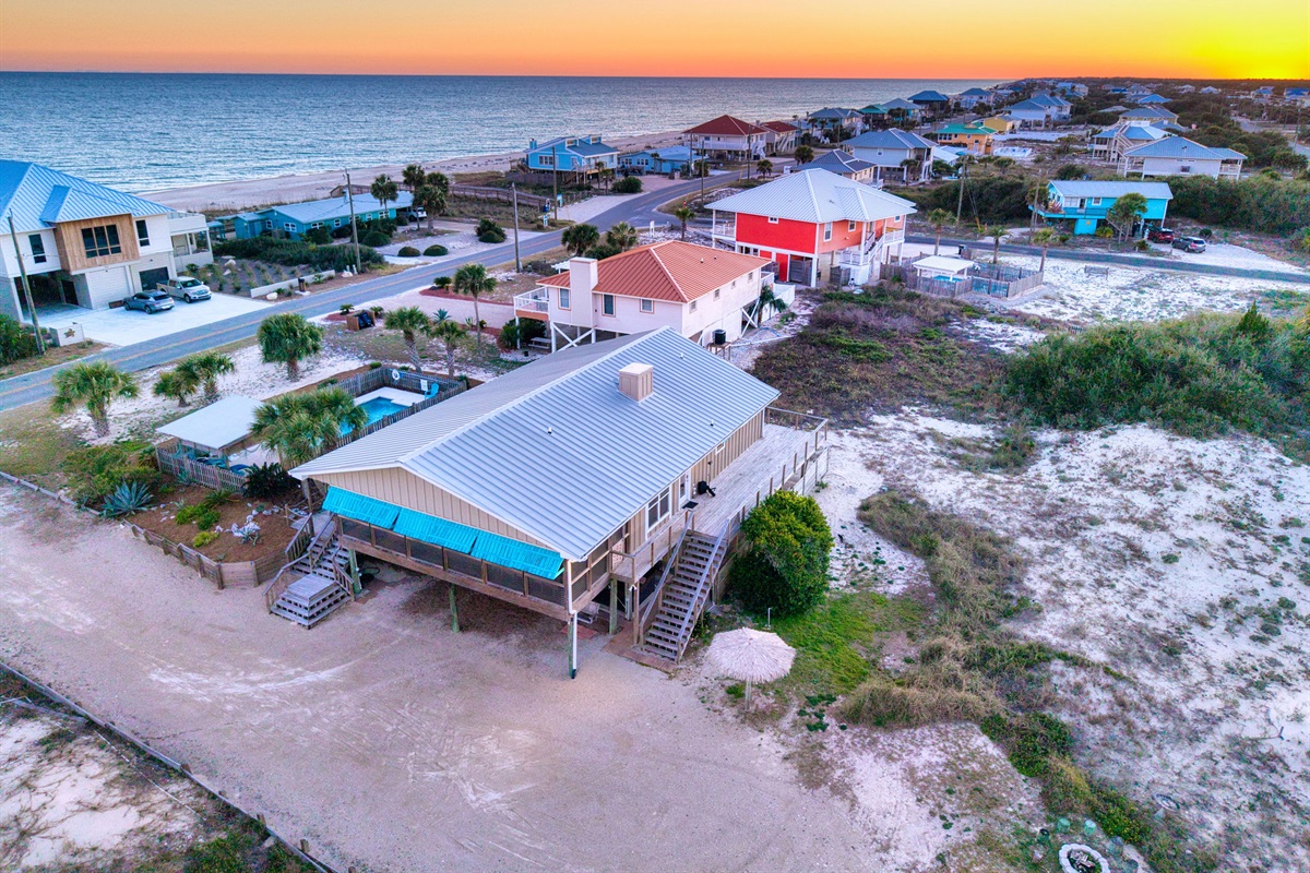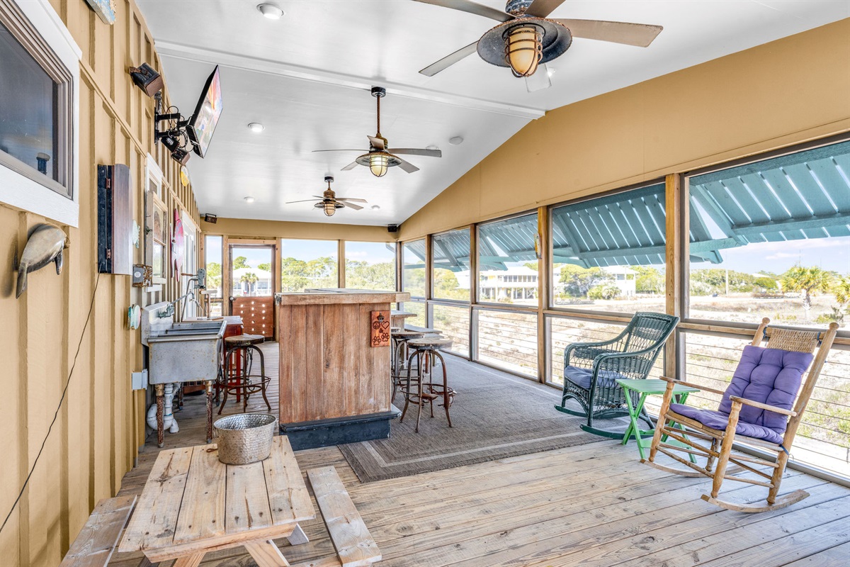 This house has unique features, such as Spanish tile throughout the living room, kitchen, dining room and wood floors in bedrooms; a large screened in porch that has proven to be a favorite hangout for families to have meals, watch the big game or big race, with a bar and tv, tables and chairs and ceiling fans; large front porch with plenty of seating that wraps around the house, connecting to the screened in porch, making it a favorite spot to seek sunrises and toast sunsets, overlooking the pool to supervise the kids and view the beautiful Gulf of Mexico. From the front porch, you can also see dolphins in their playing glory.