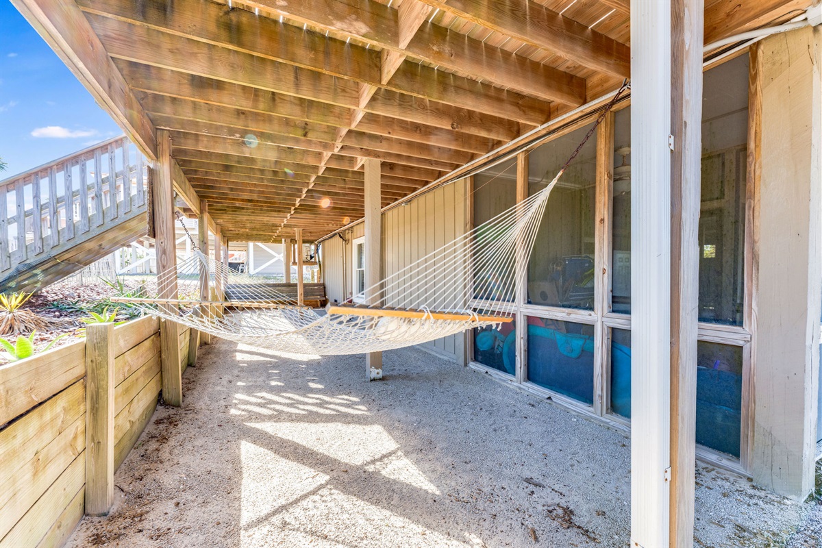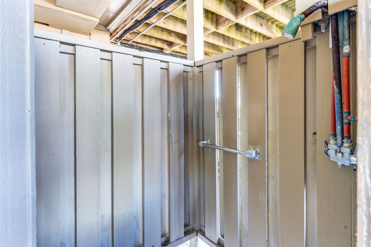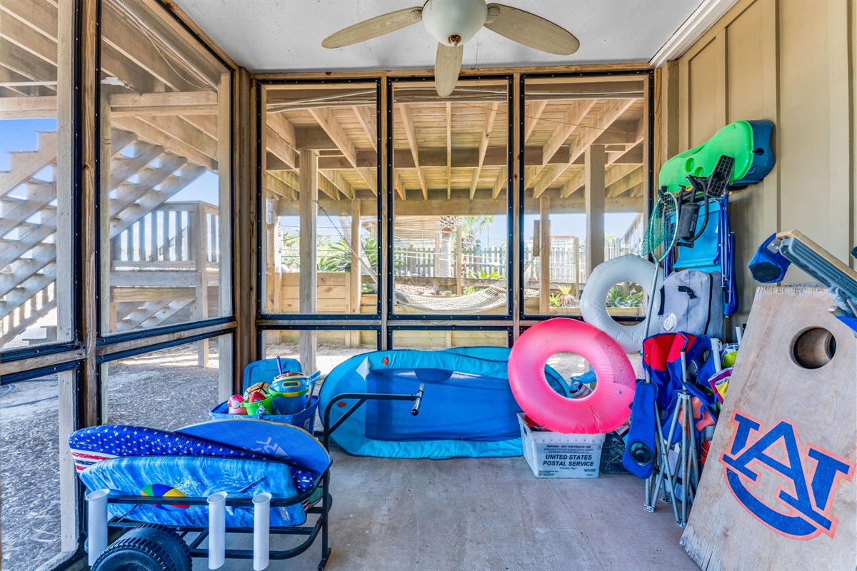 Beach chairs, umbrella and a beach cart are in the guest storage area under the house,
