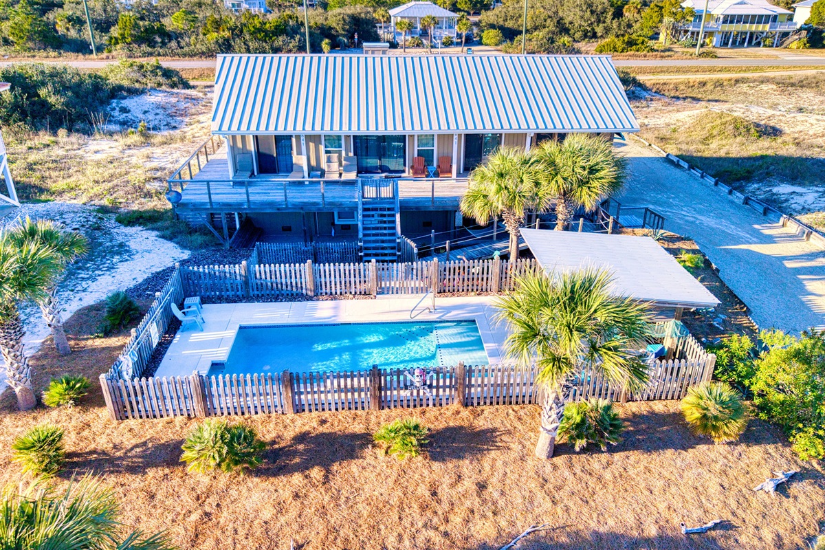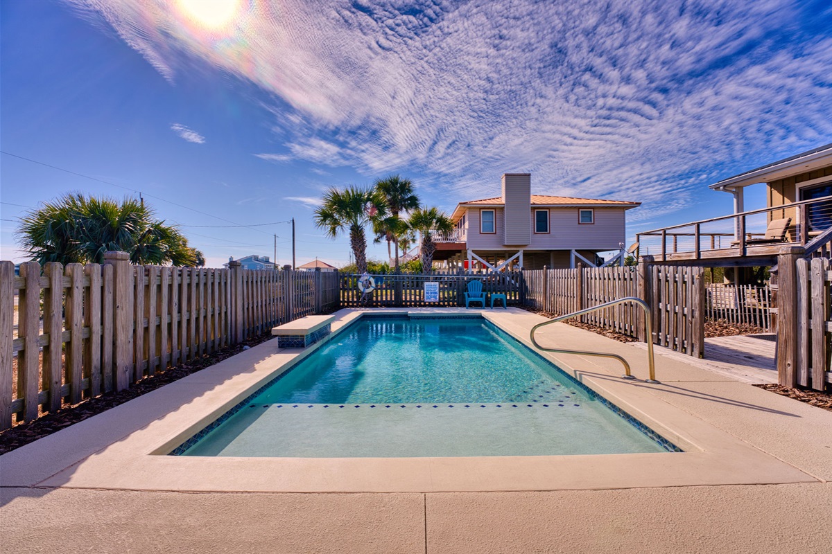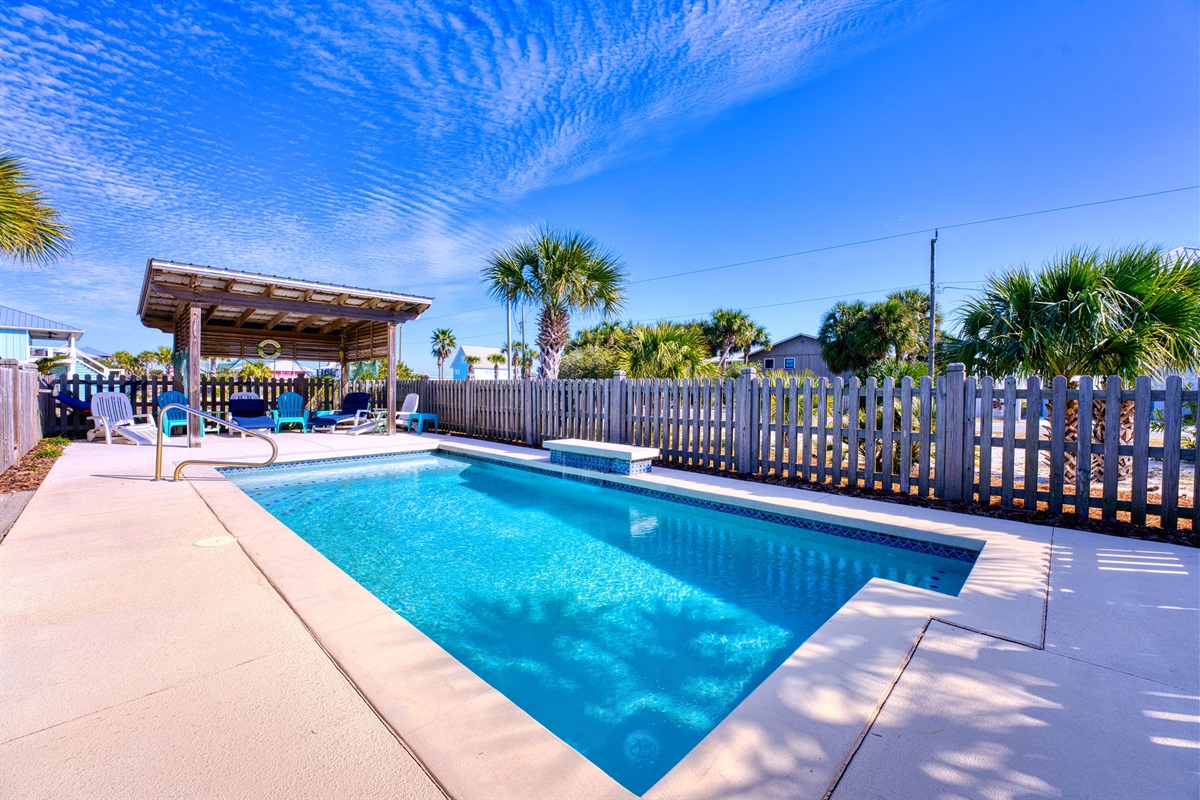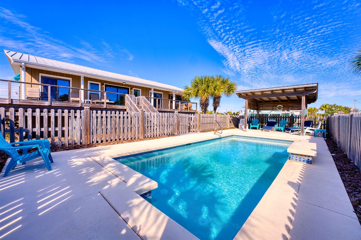 Your therapeutic retreat at Dune Therapy has everything you could want in an island vacation home! Just steps from the beach, private waterfall pool, , hot tub, corn hole, outside screened and covered bar with tv, and the list goes on!