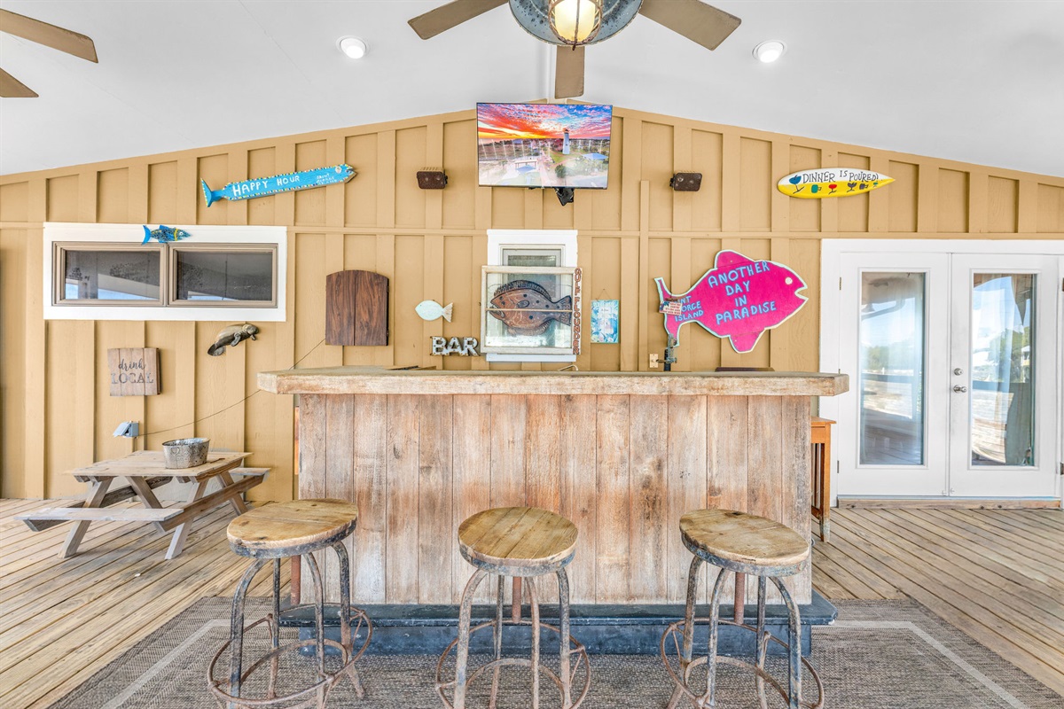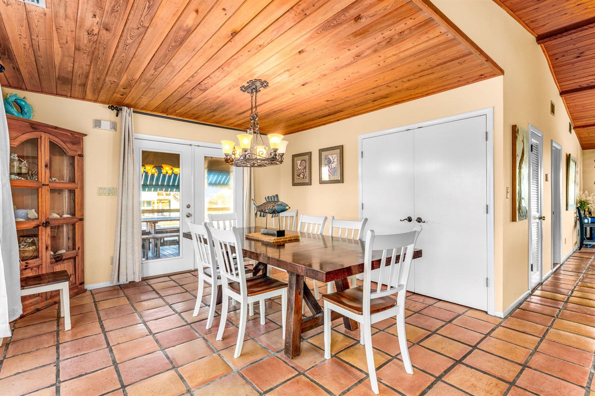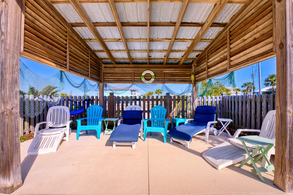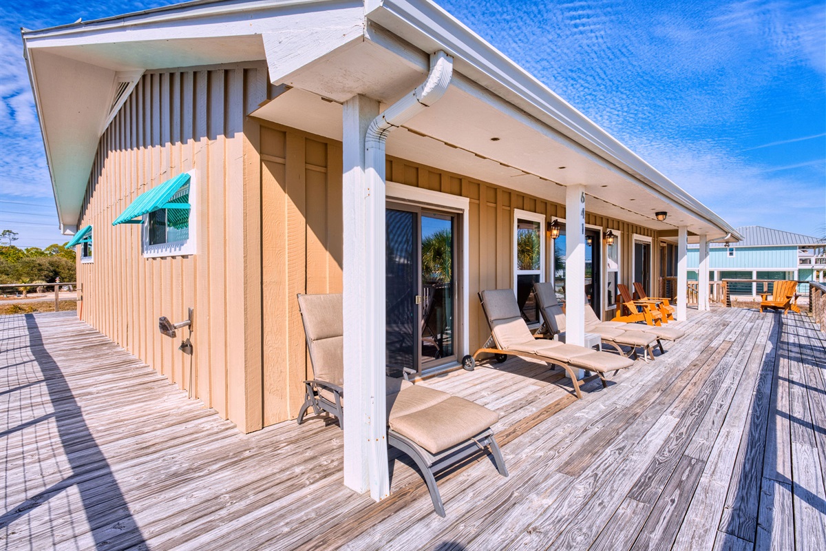 Large gas grill and a park style charcoal grill are provided under the house where you will find a fish cleaning sink and counter, as well as additional bench seating.