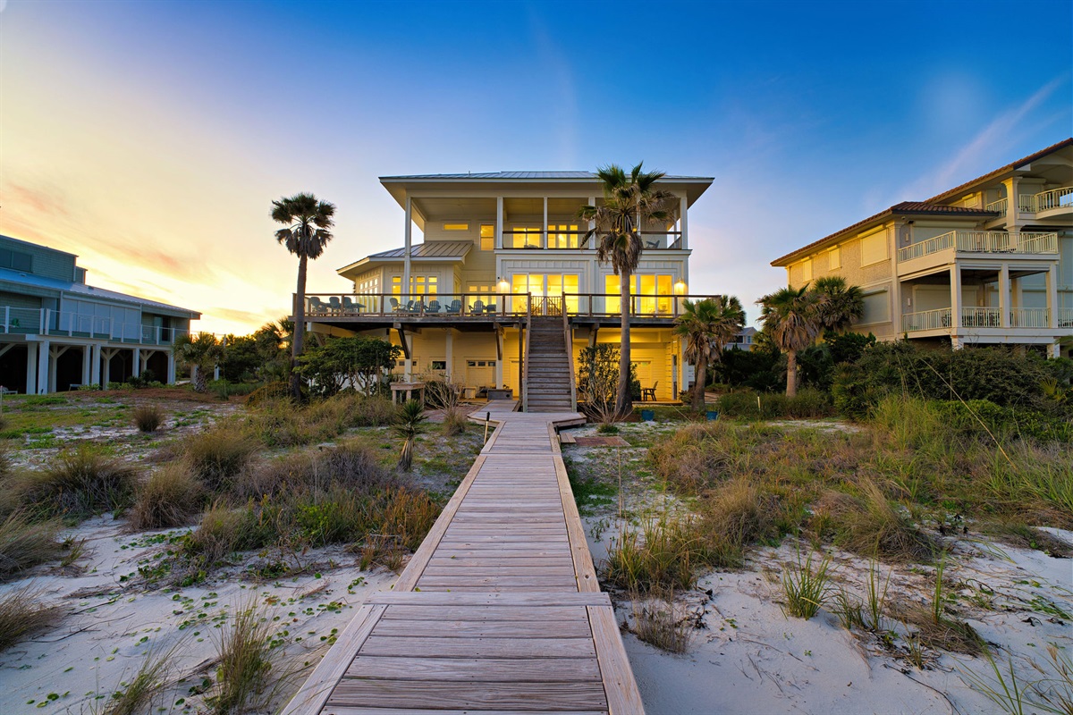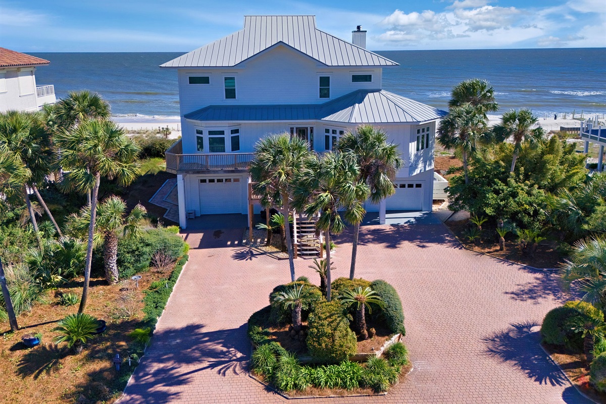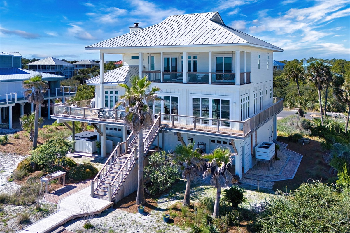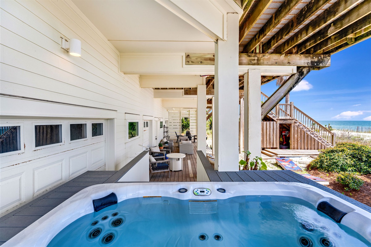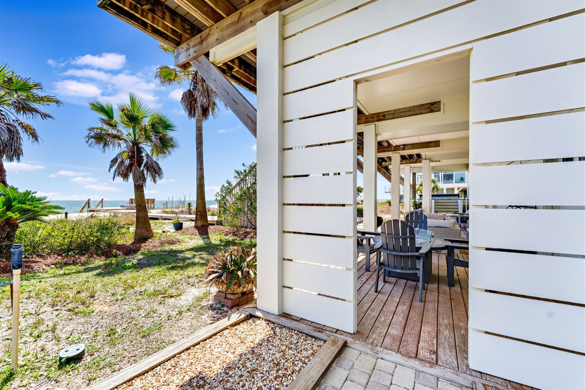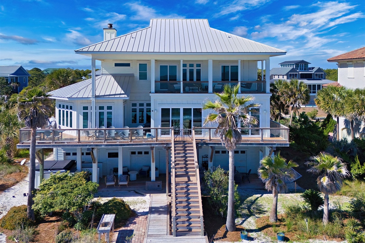 Step outside to your private beachfront oasis. Expansive decks on multiple levels provide the ideal setting for morning coffee while watching dolphins, sunset cocktails, or alfresco dining with the sound of waves as your soundtrack. The outdoor dining area seats 8-10 under the stars. Unwind in the private hot tub while taking in uninterrupted Gulf views. A beautifully landscaped yard with native palms and coastal plantings leads directly to the sugar-white sand beach.
