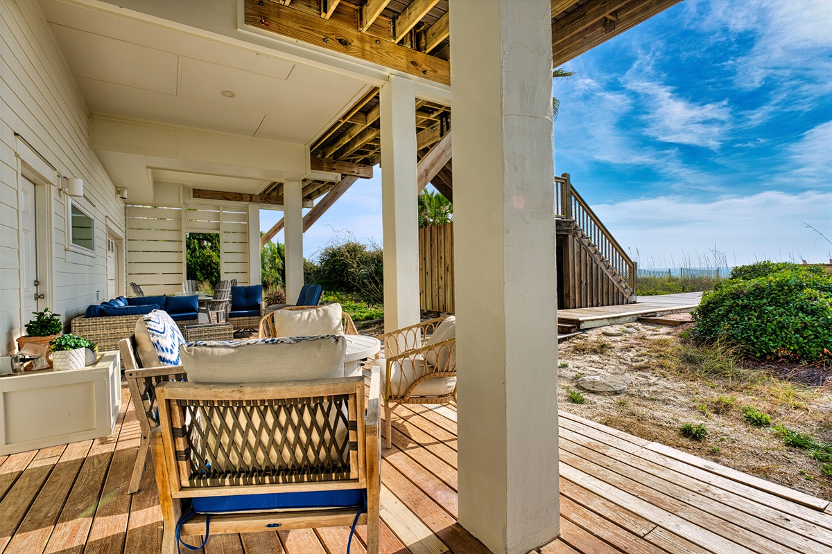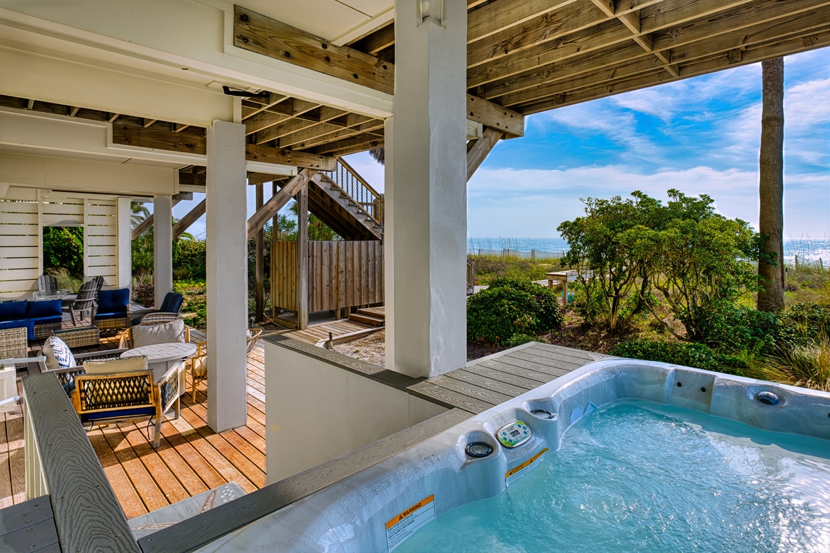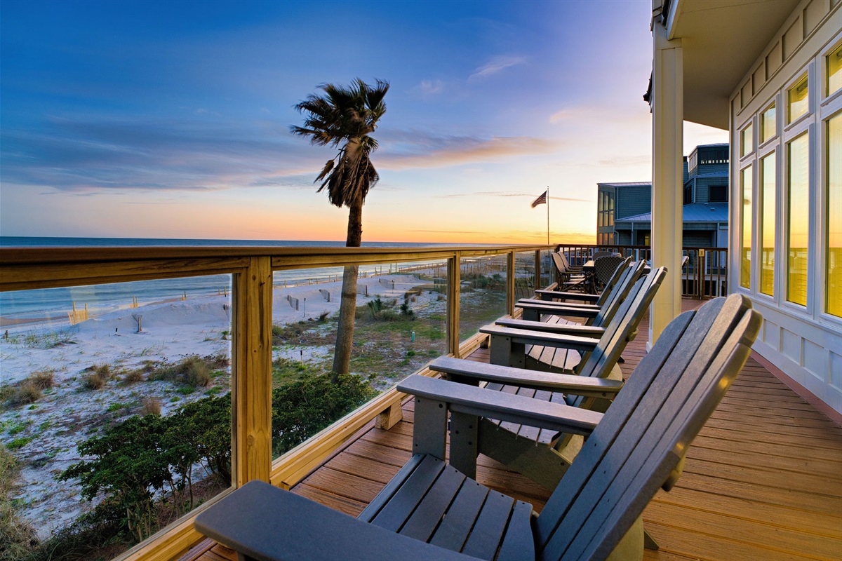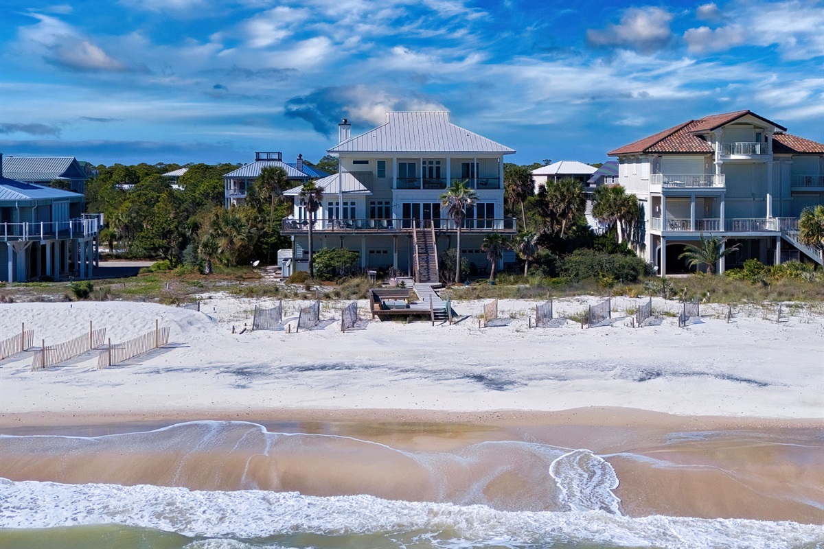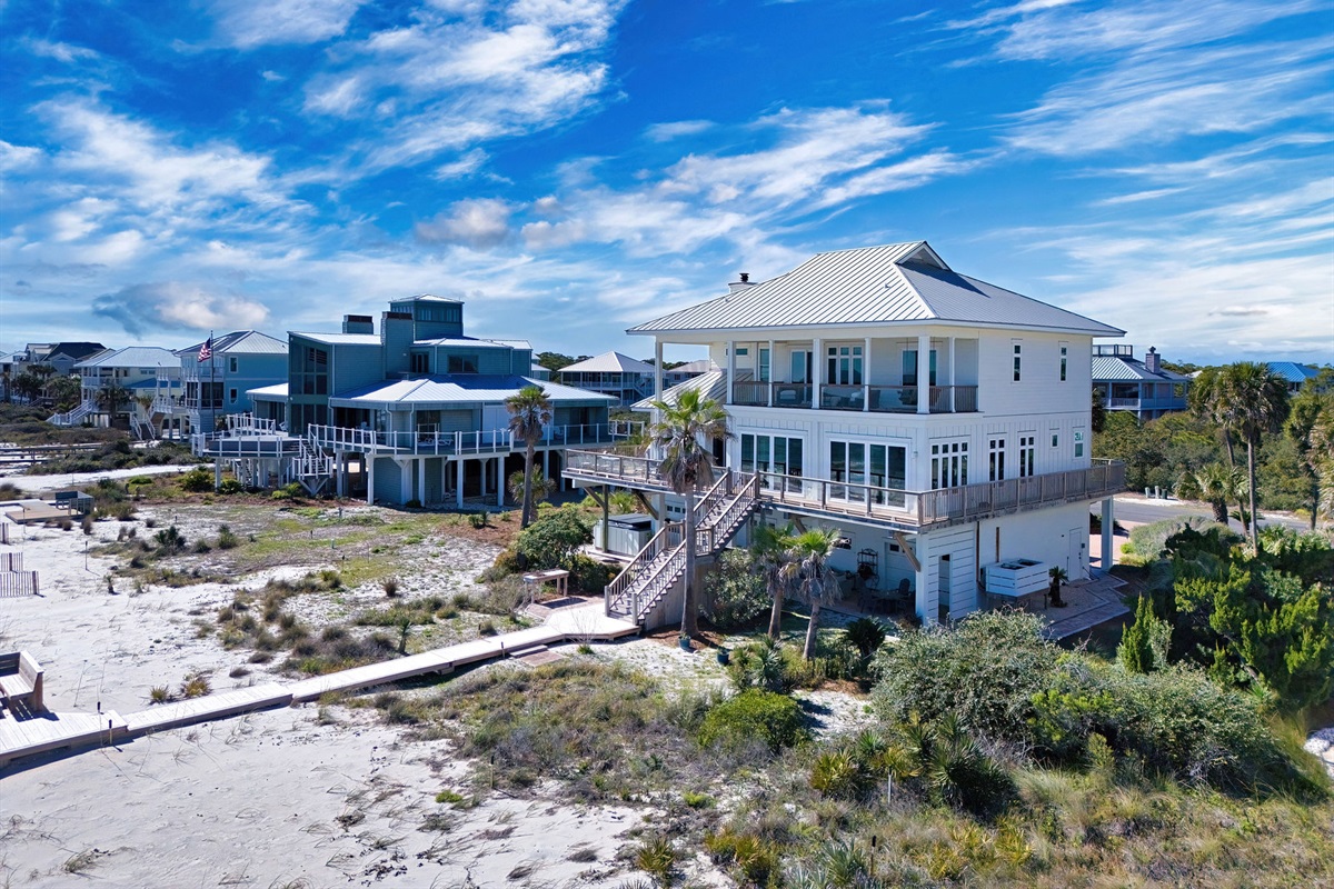 Step outside to your private beachfront oasis. Expansive decks on multiple levels provide the ideal setting for morning coffee while watching dolphins, sunset cocktails, or alfresco dining with the sound of waves as your soundtrack. The outdoor dining area seats 8-10 under the stars. Unwind in the private hot tub while taking in uninterrupted Gulf views. A beautifully landscaped yard with native palms and coastal plantings leads directly to the sugar-white sand beach.