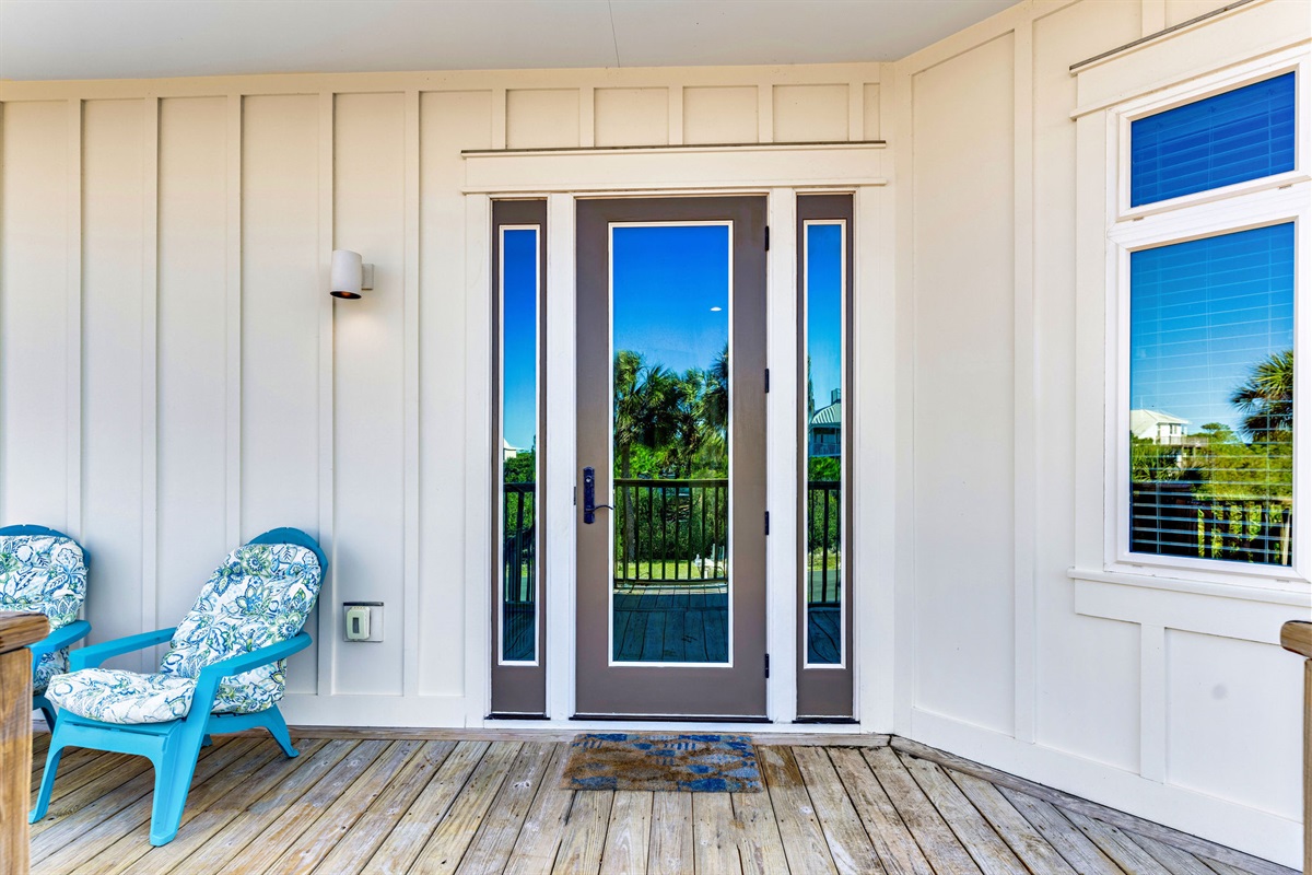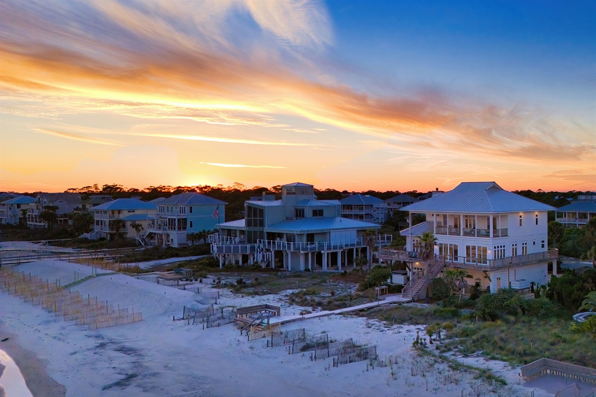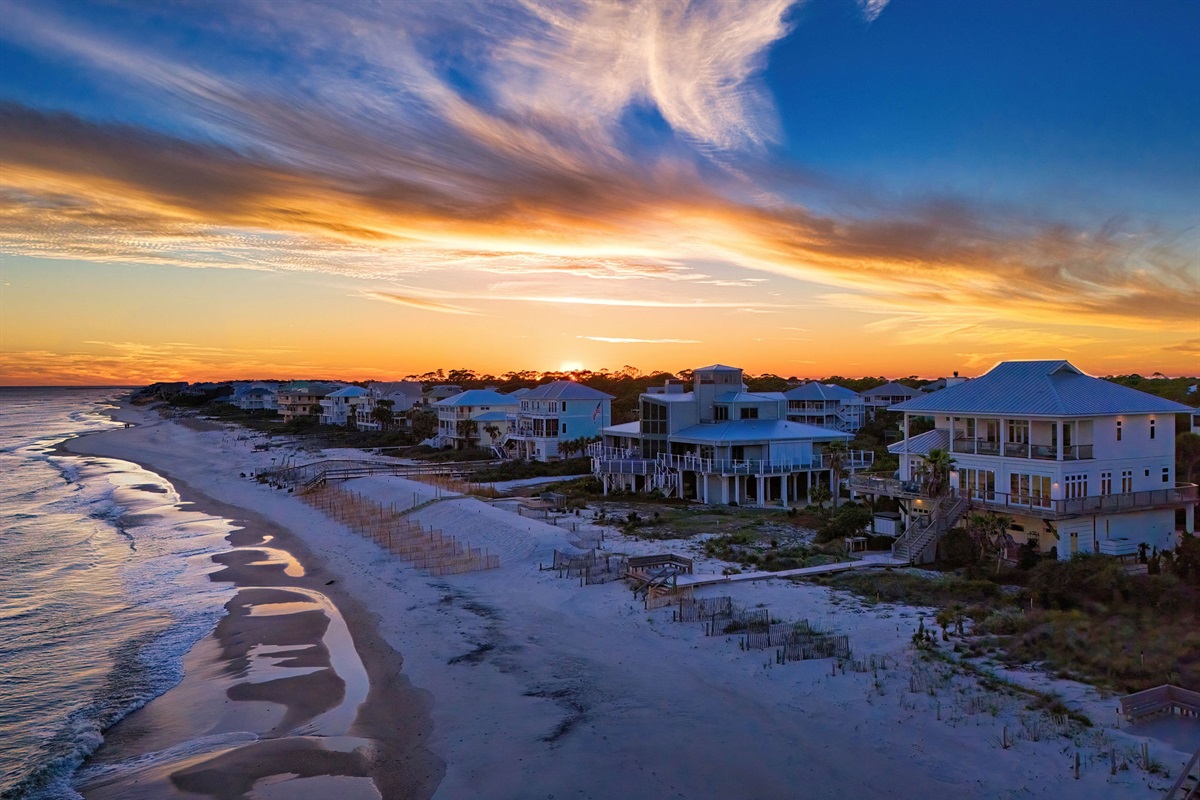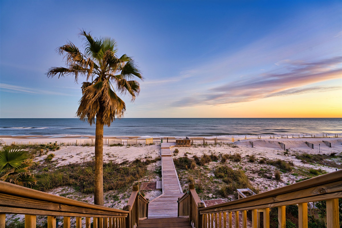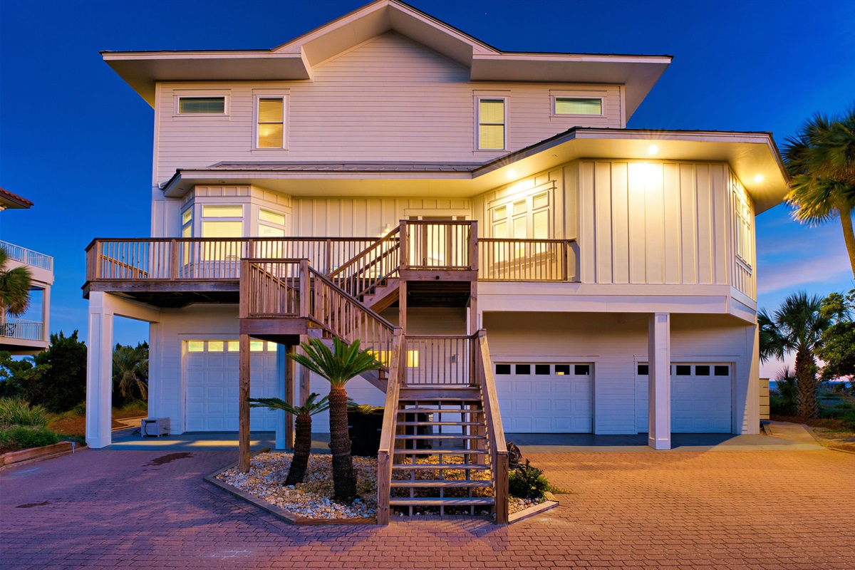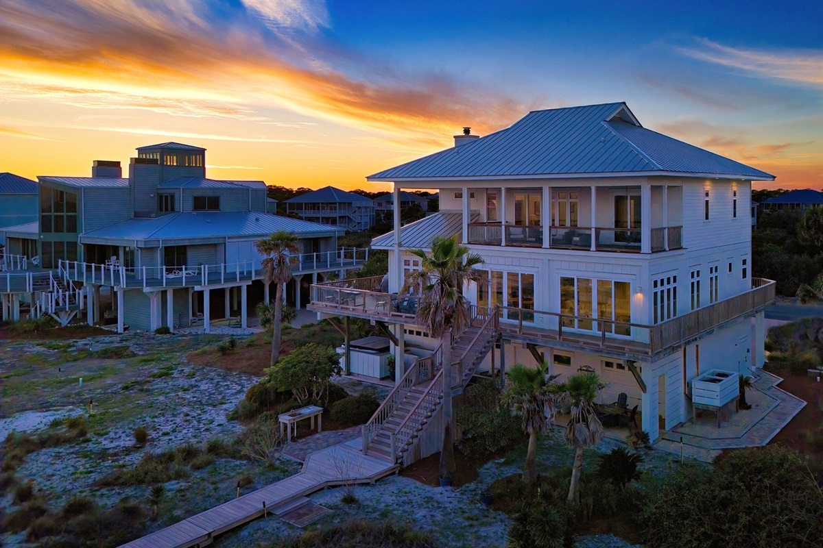 Step outside to your private beachfront oasis. Expansive decks on multiple levels provide the ideal setting for morning coffee while watching dolphins, sunset cocktails, or alfresco dining with the sound of waves as your soundtrack. The outdoor dining area seats 8-10 under the stars. Unwind in the private hot tub while taking in uninterrupted Gulf views. A beautifully landscaped yard with native palms and coastal plantings leads directly to the sugar-white sand beach.