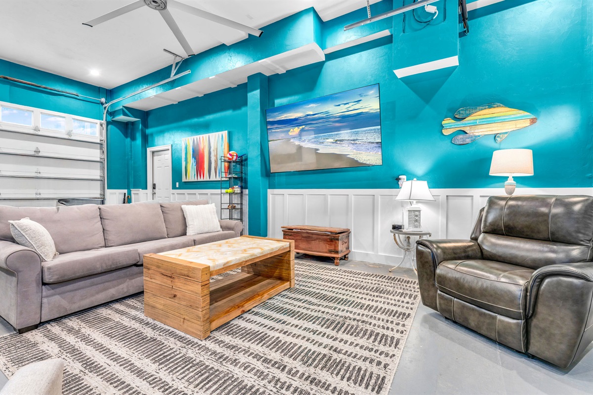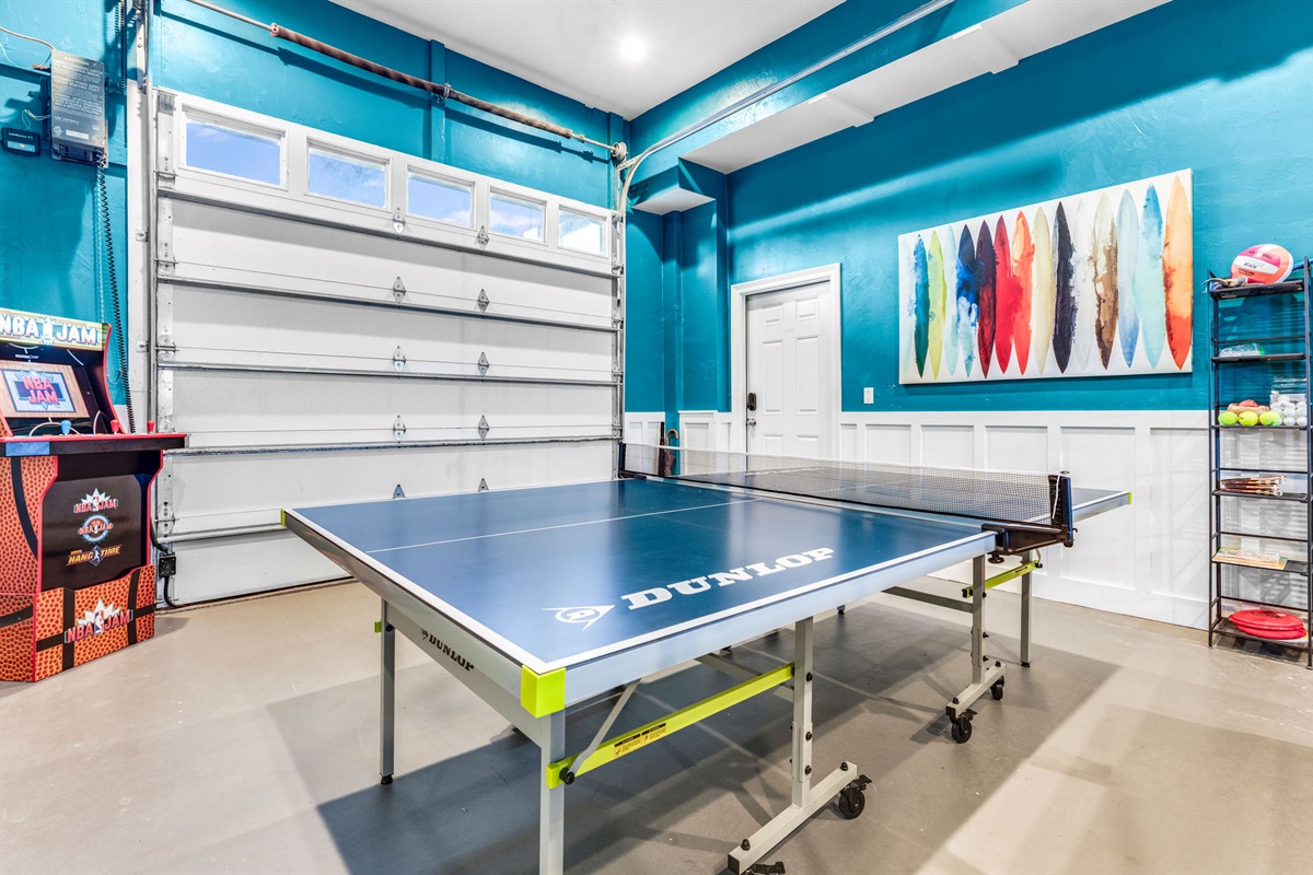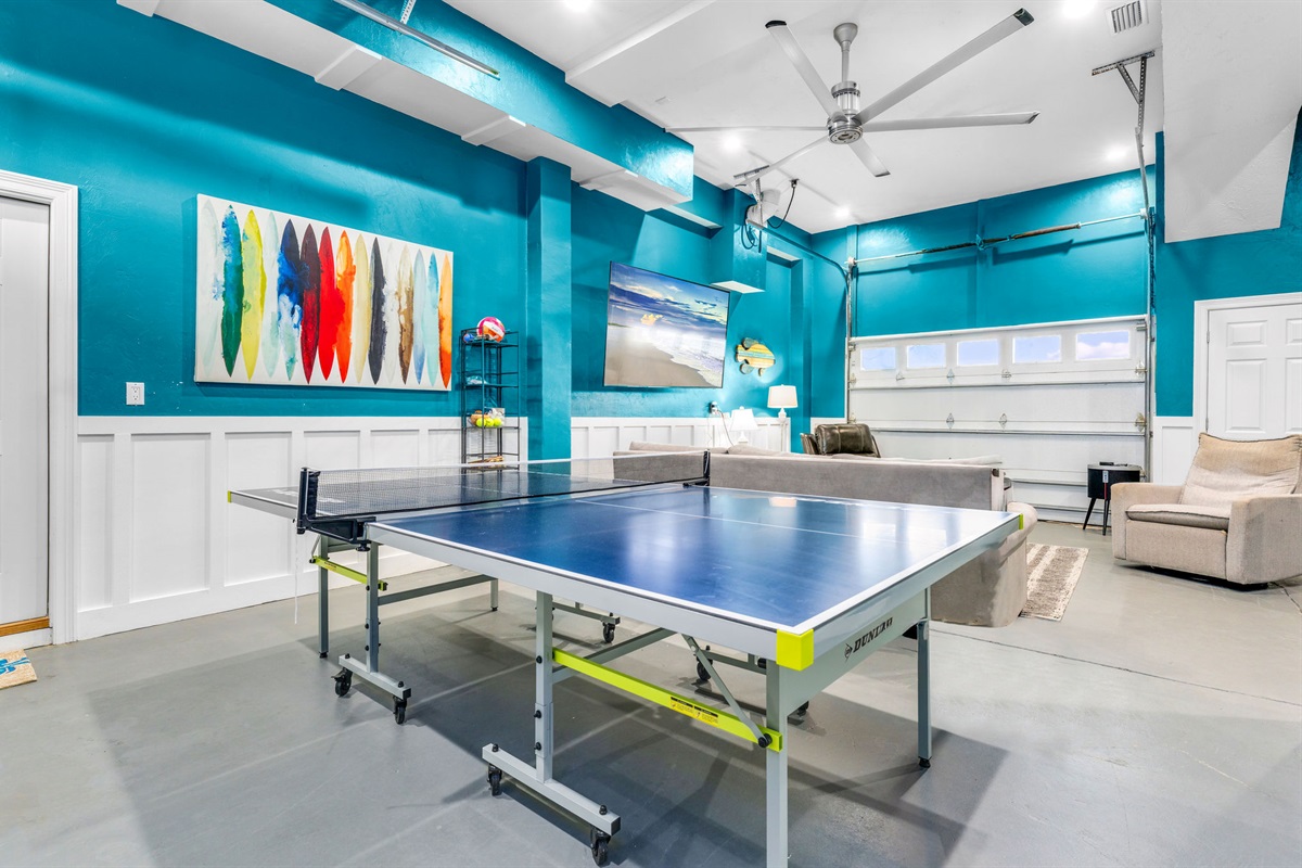 The vibrant turquoise game room is entertainment central, featuring a regulation ping pong table, arcade game, comfortable seating areas, and a large TV. With its fun surfboard wall art and energetic atmosphere, it's the perfect hangout for all ages.