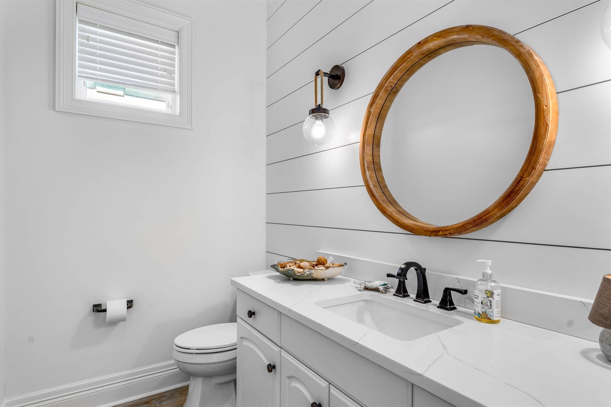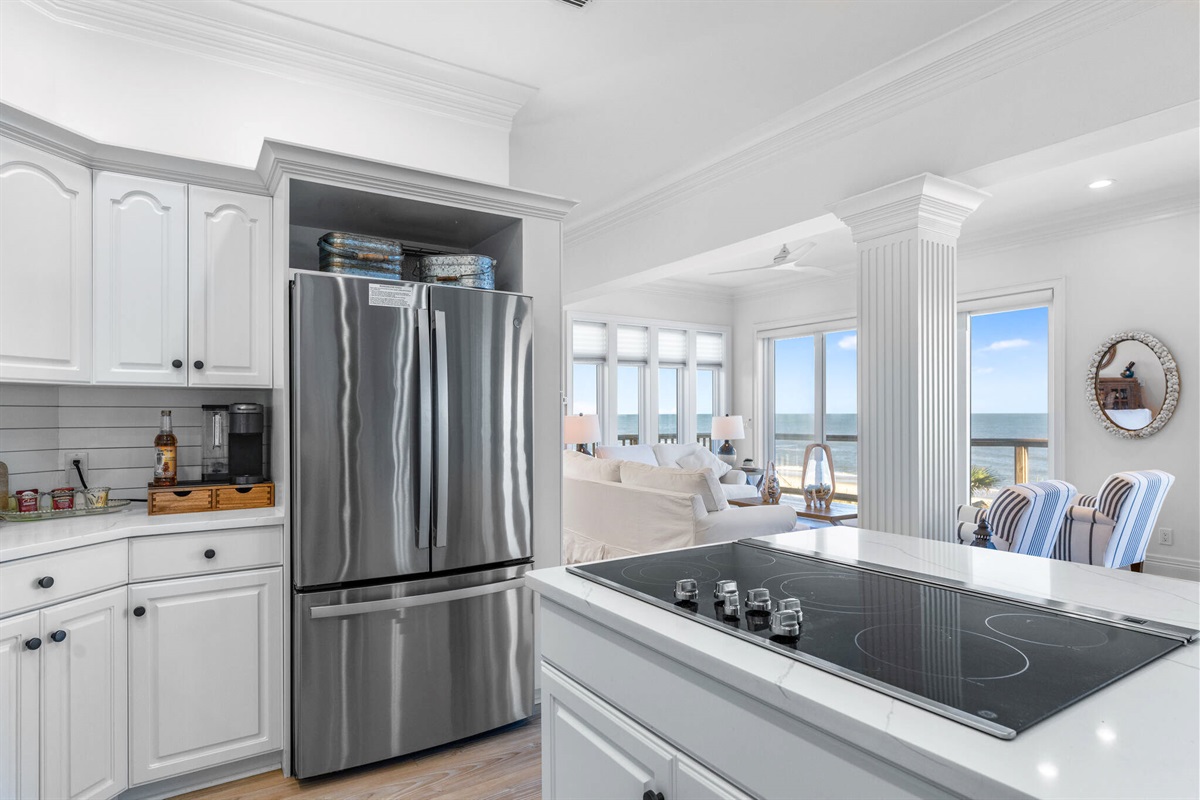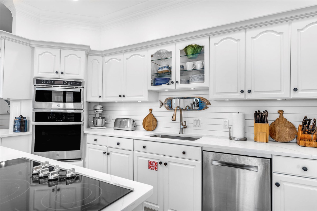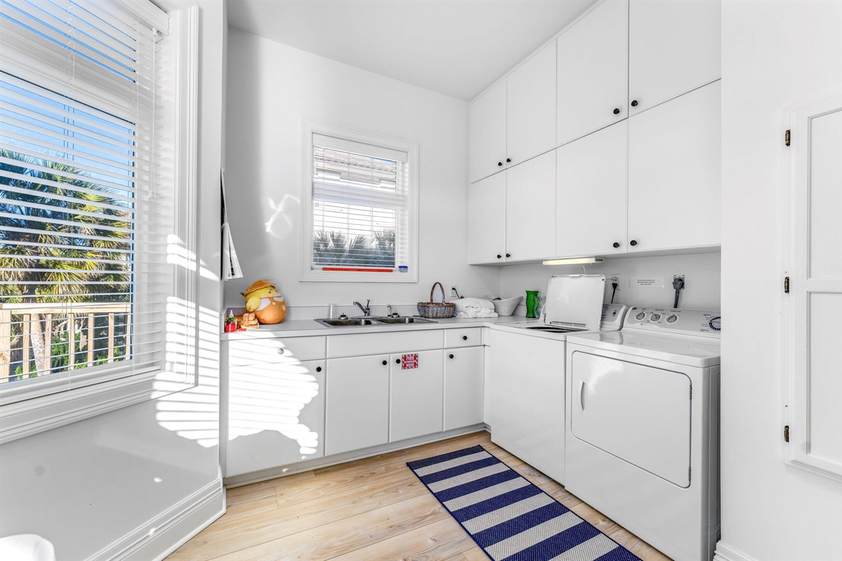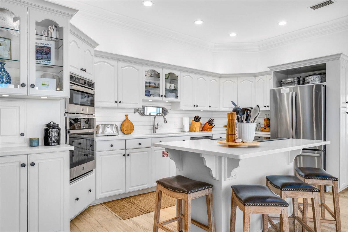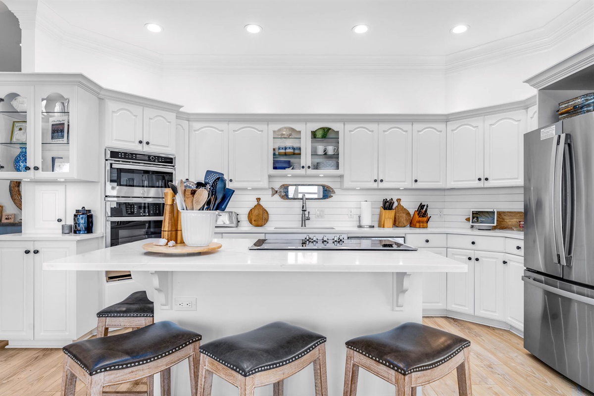 The chef-inspired kitchen is a culinary dream, featuring pristine white cabinetry, gleaming quartz countertops, professional-grade stainless steel appliances including a gas cooktop, and a large island with bar seating. The bright, airy laundry room with built-in storage keeps vacation practicalities out of sight.