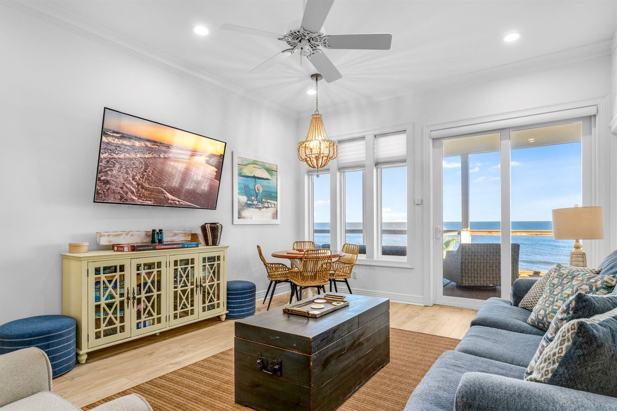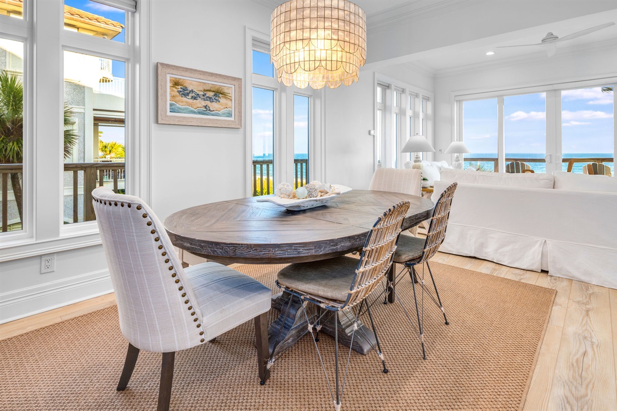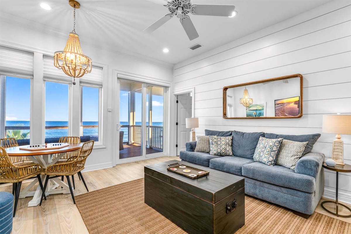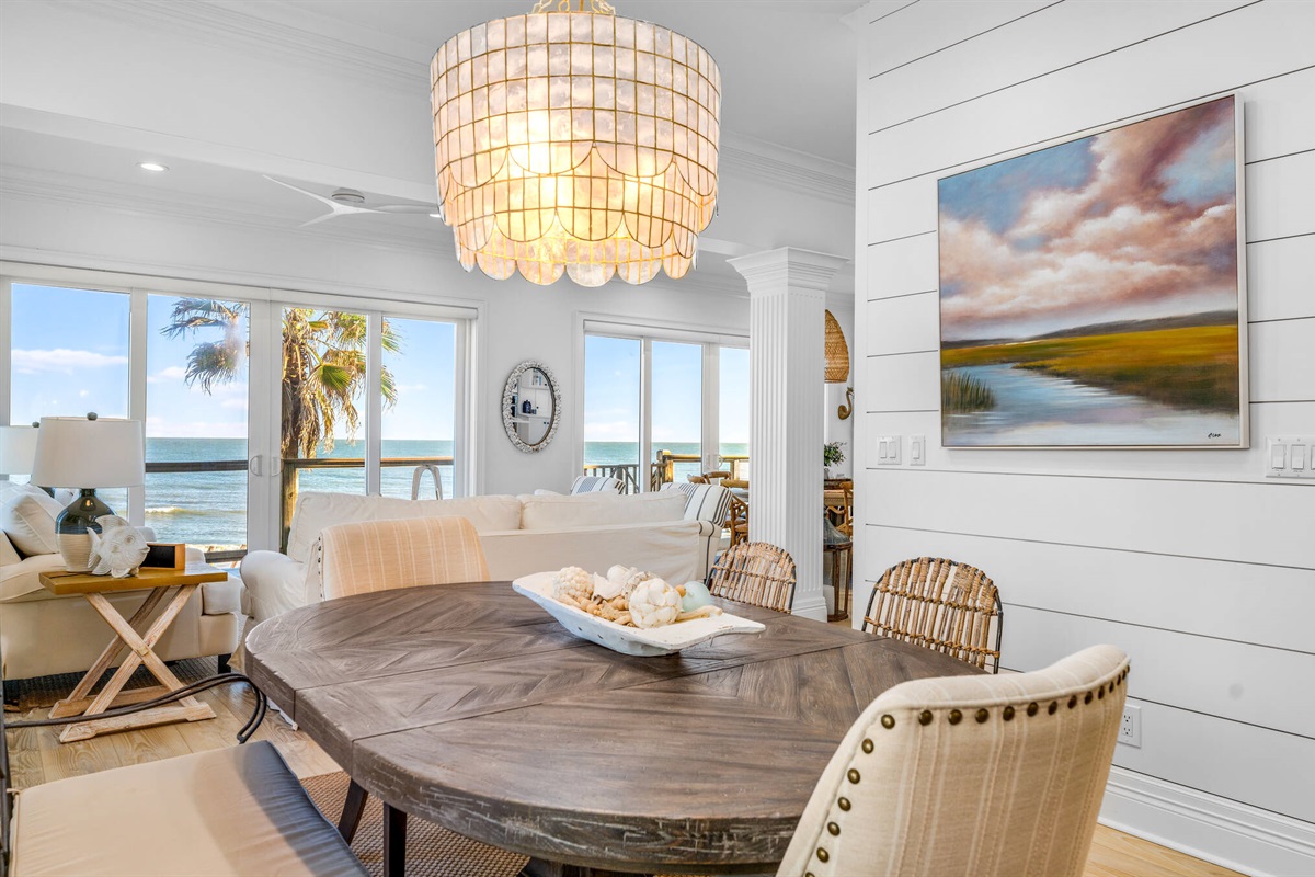 The open-concept main living area features floor-to-ceiling windows that frame breathtaking ocean views. Decorated in a sophisticated coastal palette of whites, soft blues, and natural wood tones, the space is anchored by plush seating, designer lighting fixtures, and beautiful shiplap accent walls. A stunning linear fireplace creates ambiance while the adjacent dining area seats 8-10 guests around a custom round table beneath a statement capiz shell chandelier.