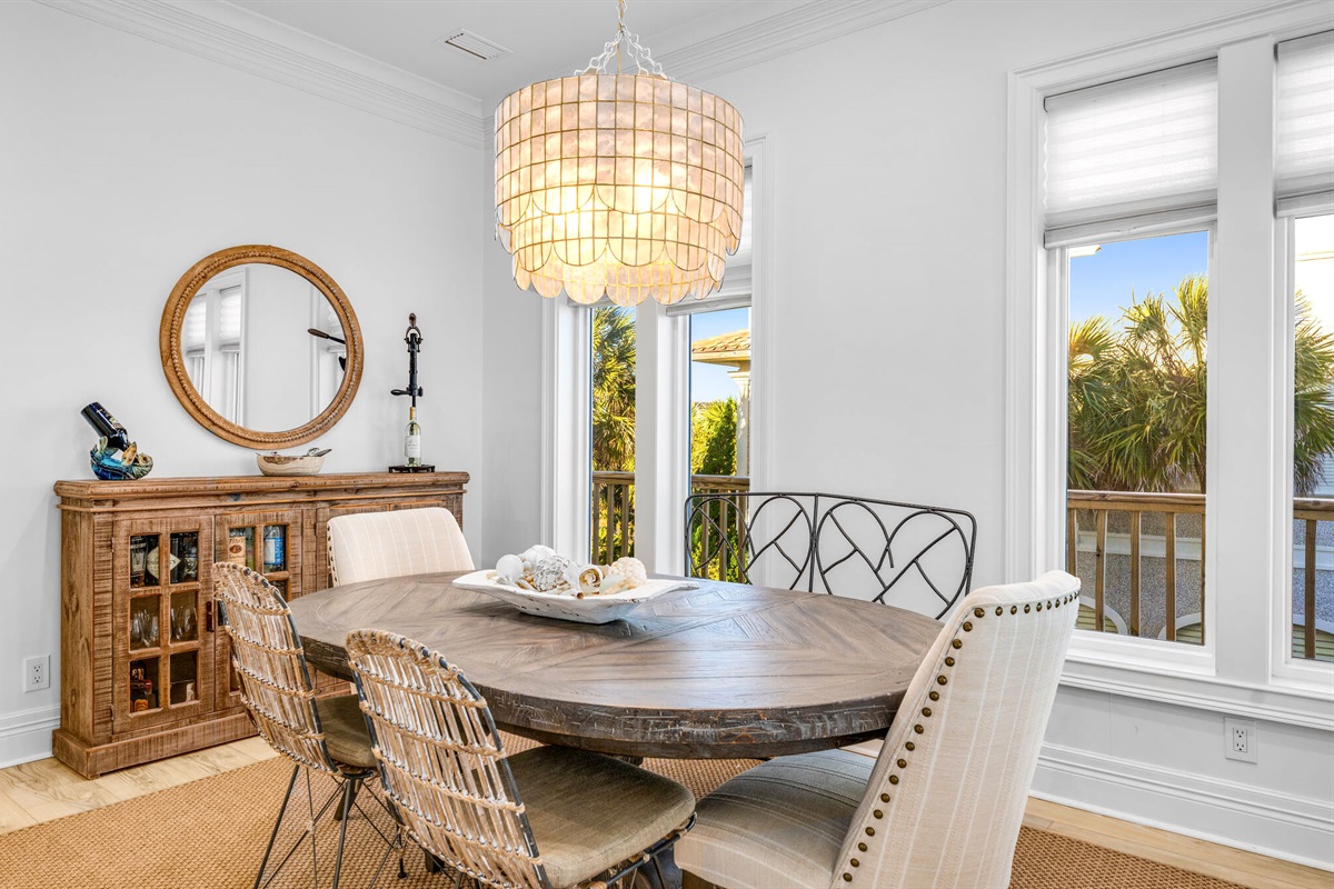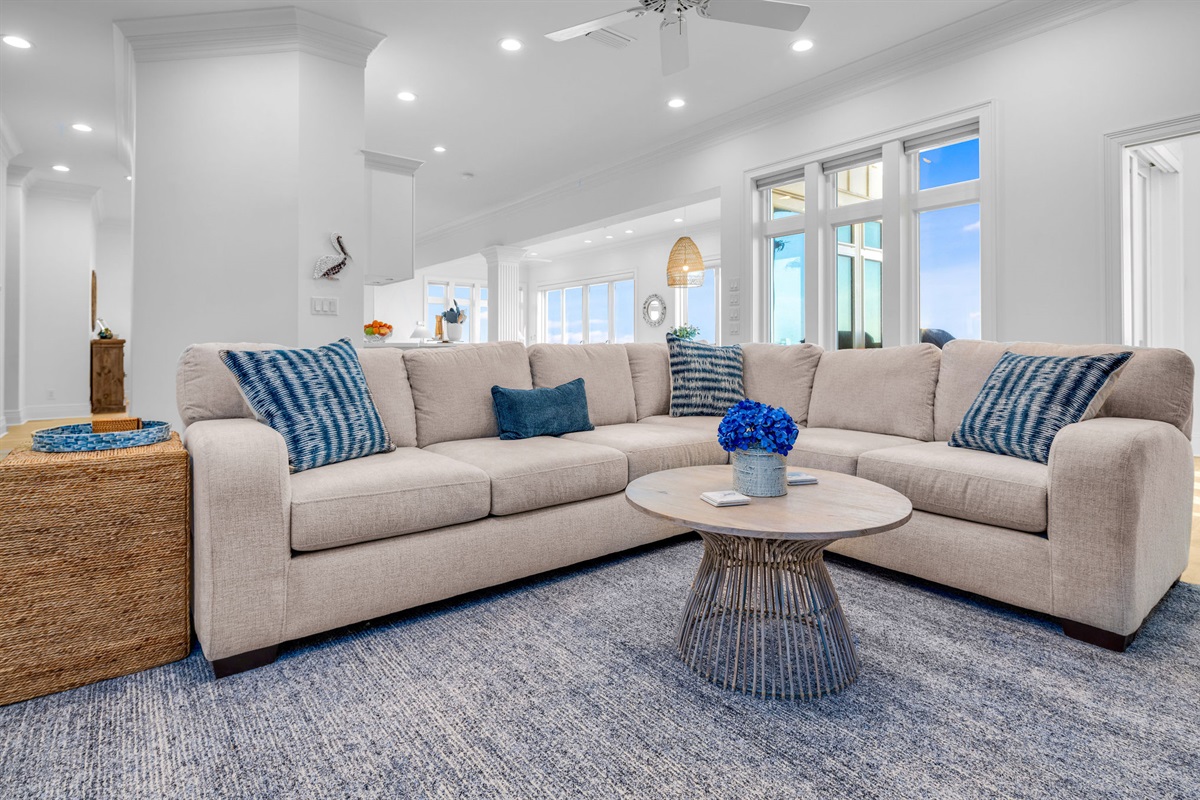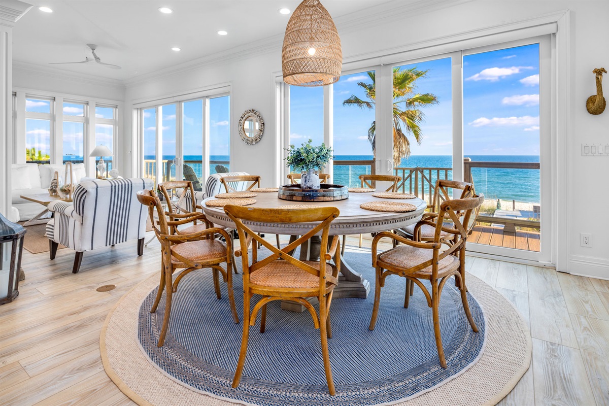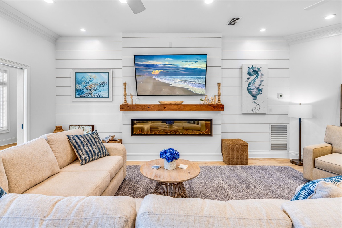 The open-concept main living area features floor-to-ceiling windows that frame breathtaking ocean views. Decorated in a sophisticated coastal palette of whites, soft blues, and natural wood tones, the space is anchored by plush seating, designer lighting fixtures, and beautiful shiplap accent walls. A stunning linear fireplace creates ambiance while the adjacent dining area seats 8-10 guests around a custom round table beneath a statement capiz shell chandelier.
