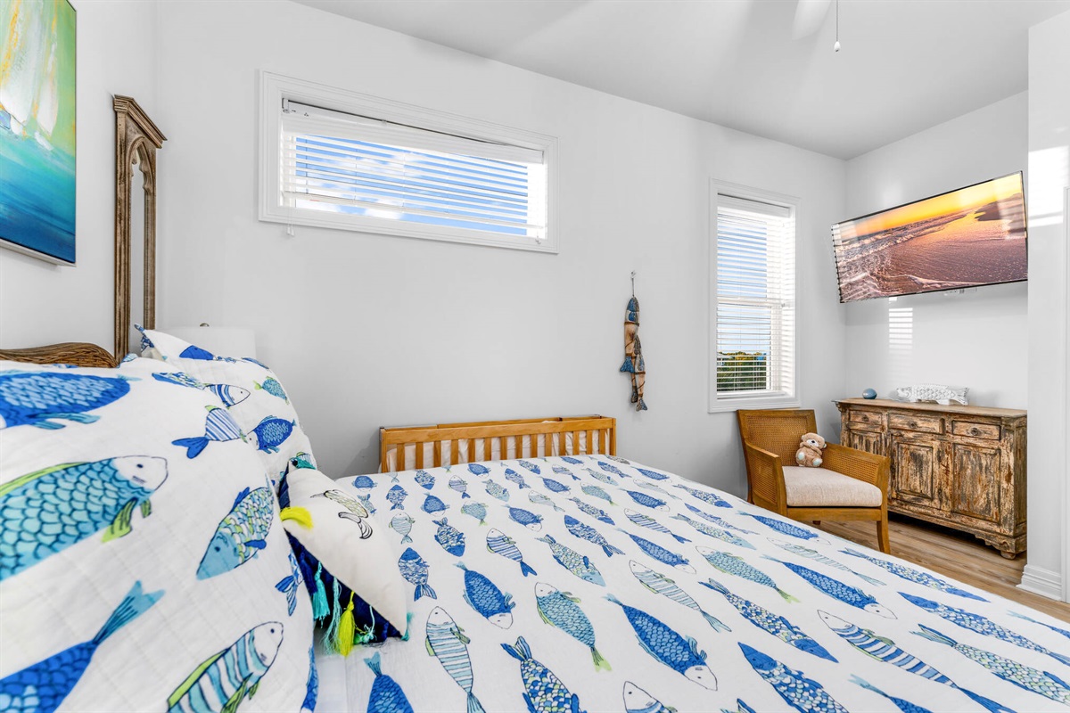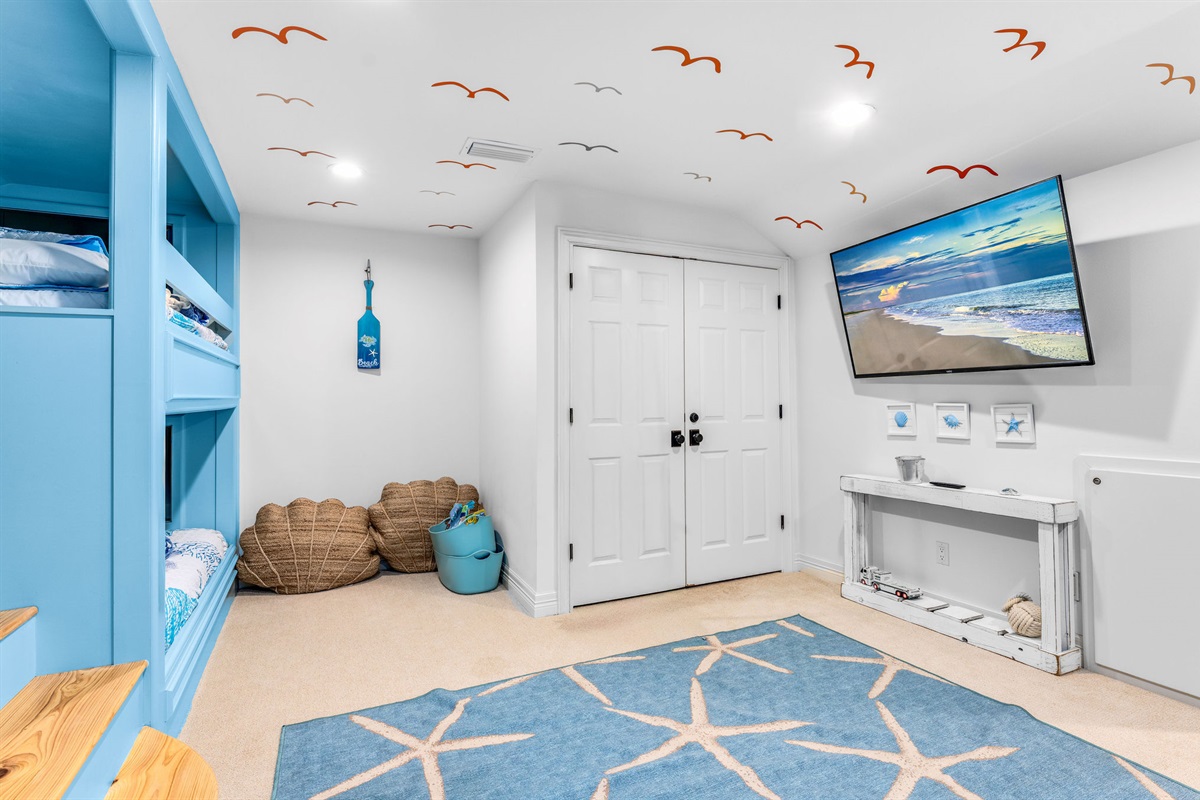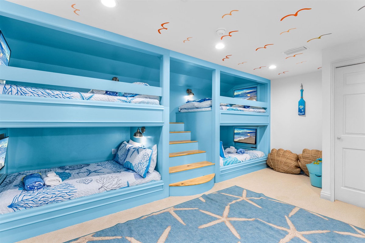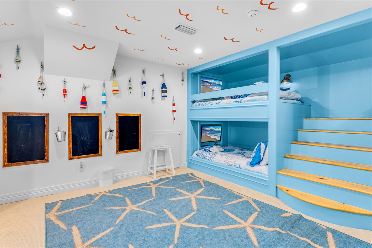 • Bunk Room: Custom-built turquoise bunk beds sleep 4, perfect for kids and creating vacation memories